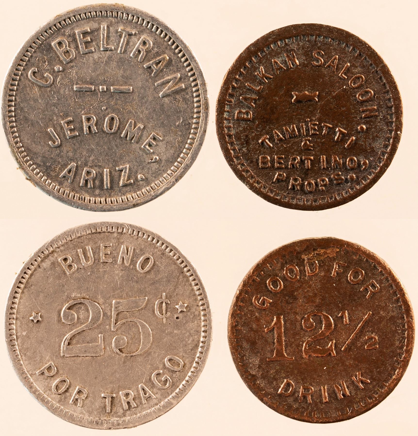 Lot of two tokens from Jerome: 1) BALKAN SALOON. / TAMIETTI / & / BERTINO, / PROPS. // GOOD FOR / 12½ / DRINK; Br. rd., 21 mm. R 9. 2) C. BELTRAN / JEROME, / ARIZ. // BUENO / 25¢ / POR TRAGO; Al., rd., 24 mm. R 9.