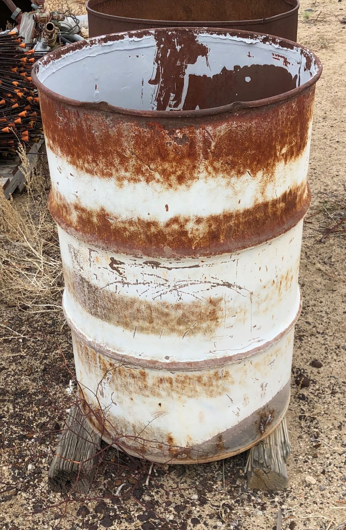 55-gallon drum 2/3 full of ball mill balls, various sizes. 1" to 2.5". imagine what you could do with these antiques!!! (southwest corner fenced yard.) (F.O.B. Fish Lake Valley, Nevada)