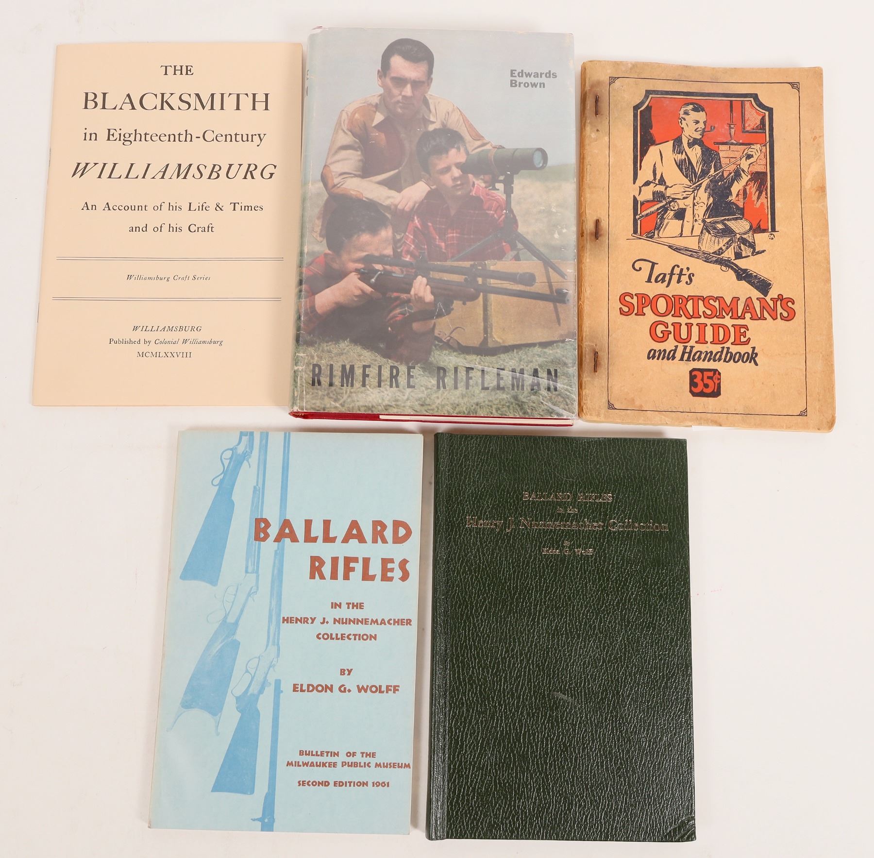 This collection of books for the outdoorsman have been long out of print but the areas hunted, fished, and techniques to shooting have not changed. "Rimfire Rifleman" by Brown 1947 outlines the techniques to accuracy shooting for rimfire shooters; hardcover with DJ pp.314. The equipment has improved as well as the super accuracy match loads for .22 making this a shooting sport for anyone 8 to 80 years old can enjoy. Shooting match grade .22 is serious good fun. "Taft's Sportsman's Guide" by Piper & Taft 1928 paperback with staple binding is a pure joy to read with photos of fishing limits long gone from Washington state. Still relevant for locations and secret spots, pp.162, good condition. "Ballard Rifles in the Nunnemacher Collection" by Wolff; two books: hardcover 1945 bent corner crisp binding; paperback second edition 1961 by Wolff with index for Ballard and Marlin catalog numbers pp.80 VG condition. A must have for the Ballard and Marlin collector. "The Blacksmith in Eighteenth-Century WiIlliamsburg" by Colonial Williamsburg press 1973 is a paperback pp. 29. Very good condition.
