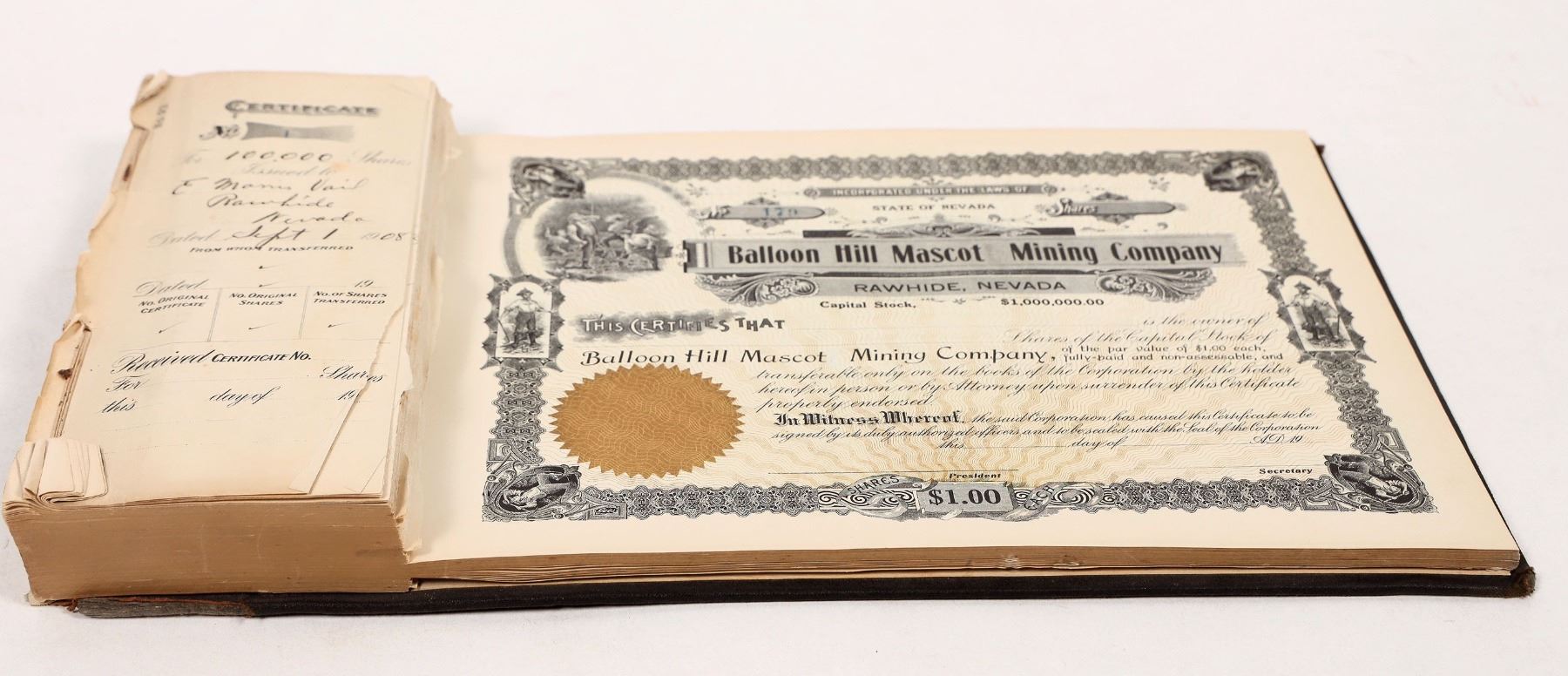 Book of unissued stock certificates for Balloon Hill Mascot Mining Company of Rawhide, Nevada. The certs number 179-214, with shares selling for $1 per. These are in a hardbound album, with the front cover detached but still with the piece. Please see photos for more details.