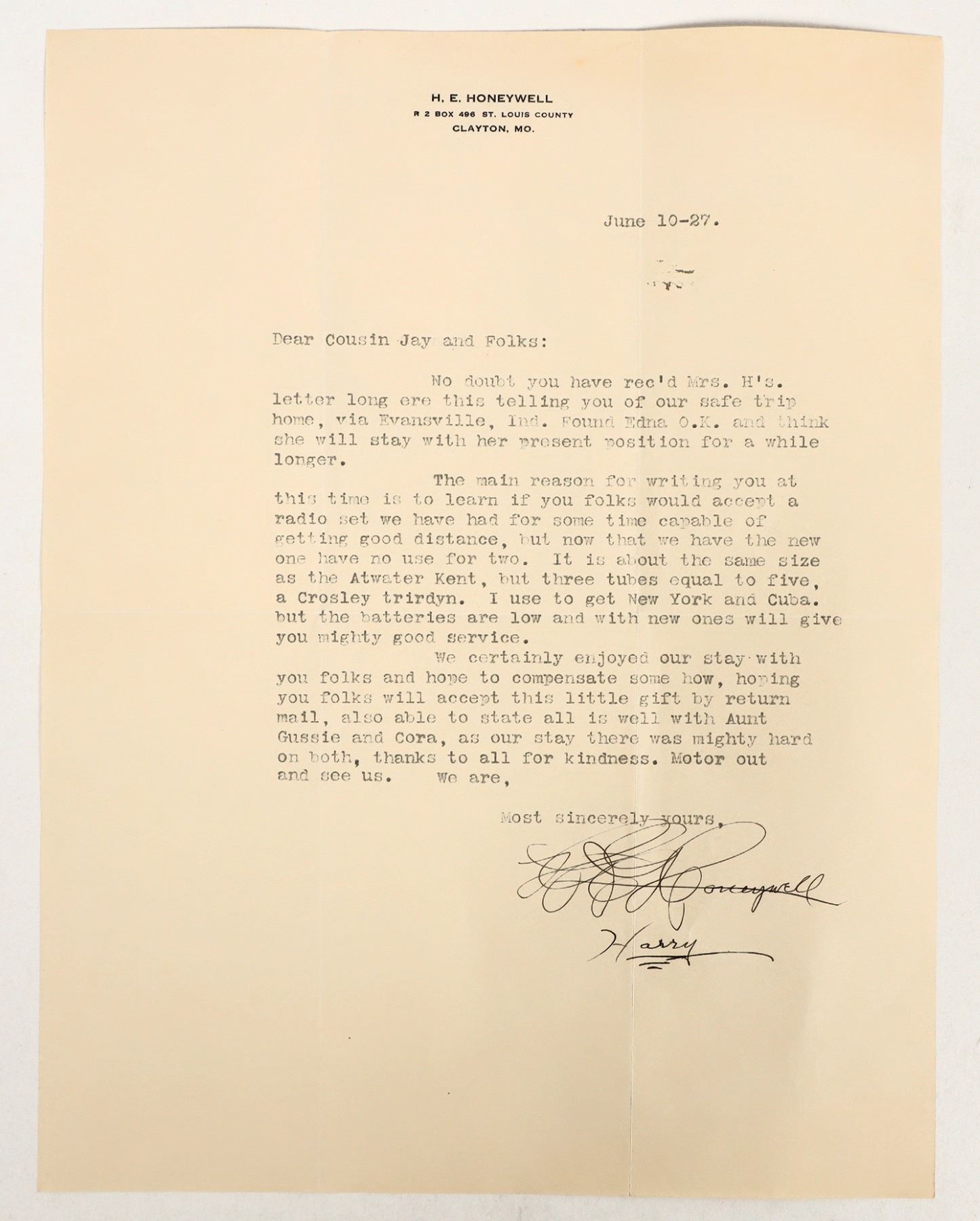 Henry Honeywell (1871-1940), who served with Dewey in Manilla during the Spanish-American War, was a world class balloon racer, winning the 1912, 1916 and 1920 balloon races. Autographed letter on his personal stationery.