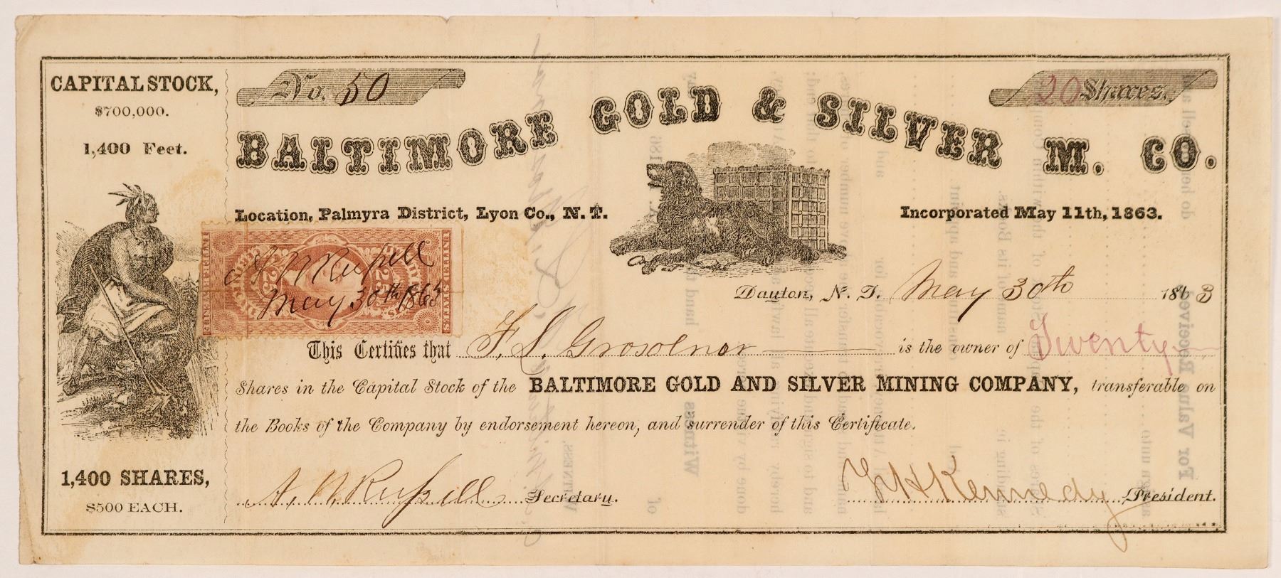 I/U #50 FS Grosolnor 20 shares 1863. Dog vignette. Dayton dateline, mine in Palmyra(Como). Creases