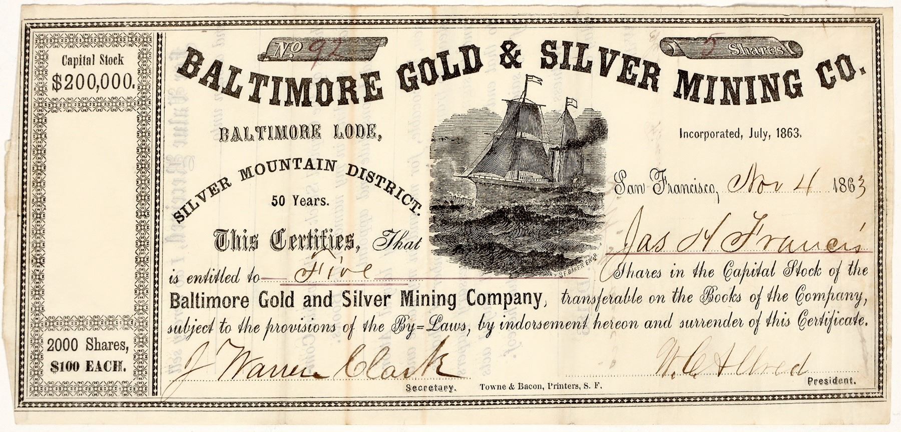 "Baltimore Lode, Silver Mountain District" printed to the left of a great ship vignette by SF Baker. Inc. July 1863. No. 92, issued for 5 shares to Jas. H. Francis in SF in Nov. 1863. Signed by president Allred and secretary Clark. Not cancelled. Black border and print. Towne & Bacon, SF. Deep folds, rough left edge. 4 x 8.75" J. Warren Clark was also secretary of the El Dorado Gold & Silver, Silver Prize G&S, Mammoth G&S, Tip Top G&S, Napa G&S, George Washington G&S, Sierra Nevada G&S, etc. The Baltimore claim was one of the most active companies near Silver Mountain, circa August, 1863 (Jackson, p. 50). It was located about 2.75 miles NE of the Mayo Ranch( Book "H" p. 619 (Oct 16, 1903)).