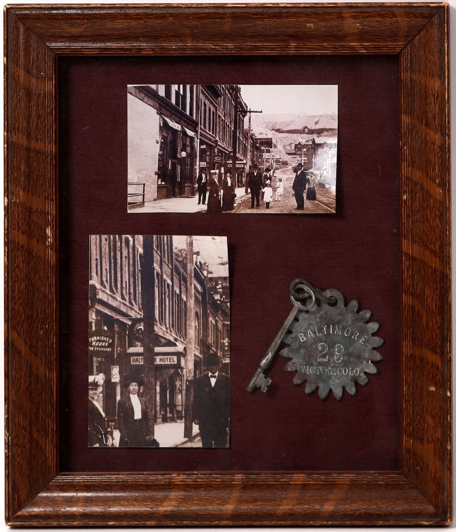 Framed Baltimore Hotel key and tag with 2 photos. 14.5x12.5".