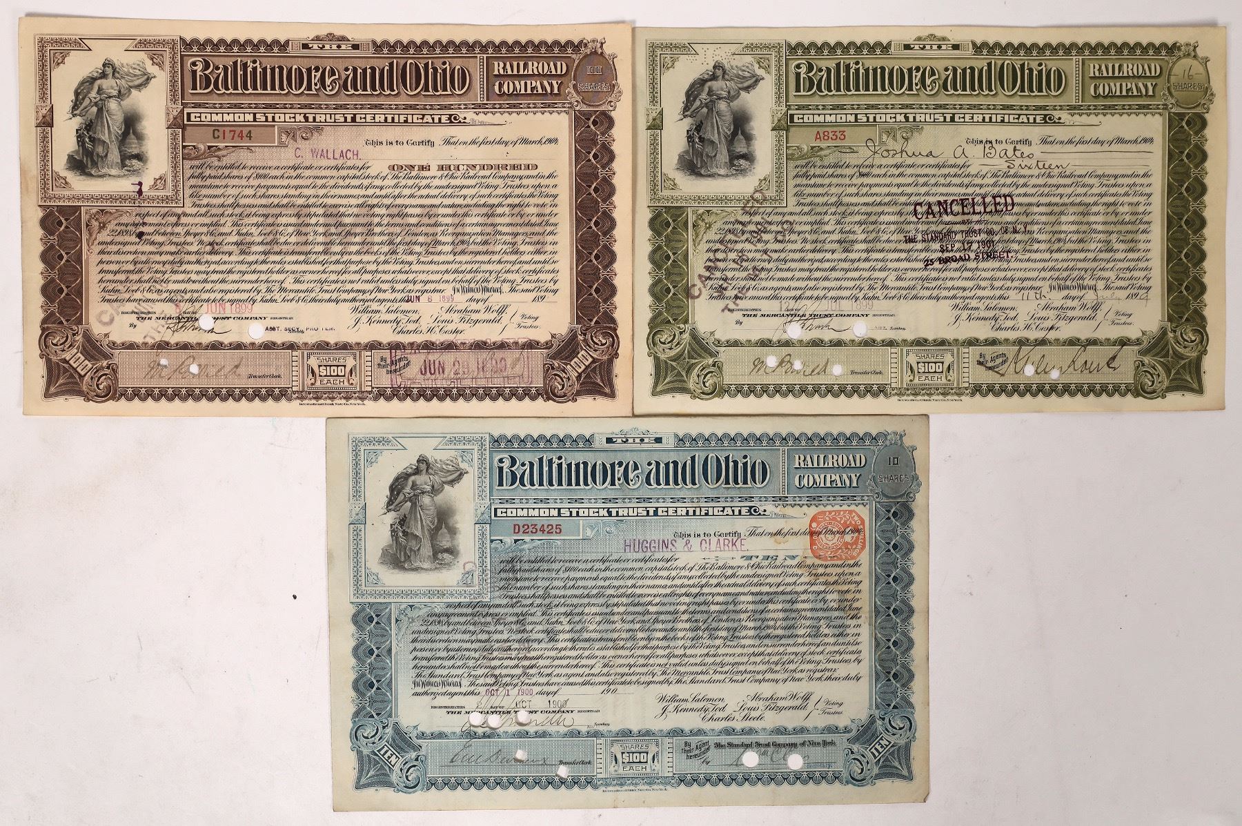 Baltimore and Ohio Rail Road Company, 3 pieces1899-1900, multiple colors, common stock trust certificate, multiple share numbers, issues