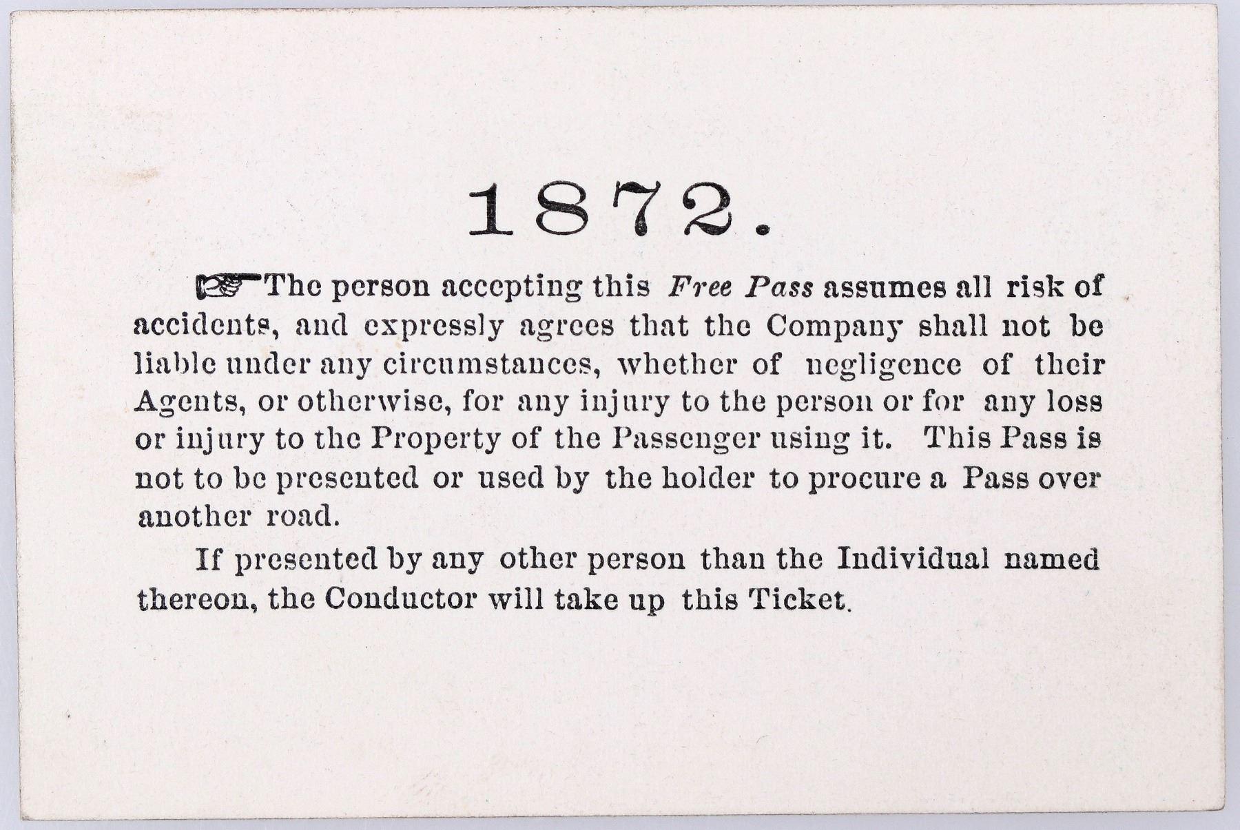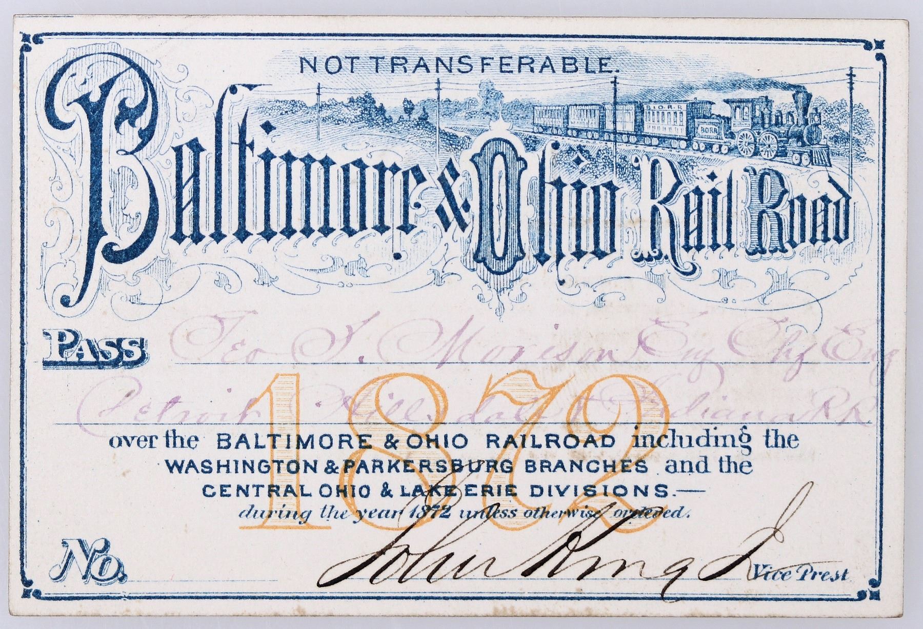 Pass issued for the year 1872 to Geo. Morison. Signed by vice president John King. Blue print, gold underprint, and nice vignette of train moving past telegraph poles. Includes passage over the Washington & Parkersburg Branches and the Central Ohio & Lake Erie Divisions. Nice condition. Oldest railroad in the US. Operated 1830-1987.