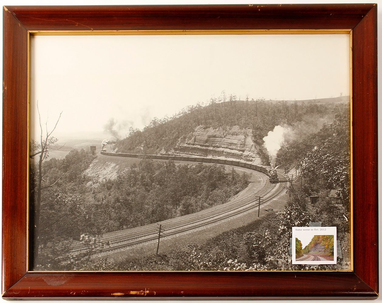 Baltimore & Ohio Railroad framed publicity photograph. Terra Alta, WV vicinity, on Salt Lick Curve, circa 1920s-1930s; view to west of coal train on uphill grade; in original, sealed 21" x 28" mahogany frame; reverse marked "NY Frame & Picture Co., 116 Fulton St.Ó; includes photo of current view of site and location map Date: Location: West Virginia HWAC# 571903