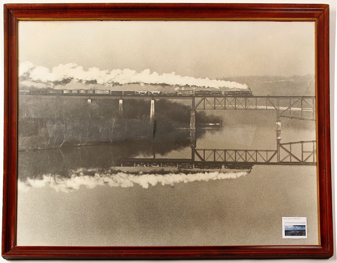 Baltimore & Ohio Railroad framed publicity photograph. Perryville MD at Susquehanna River crossing; ca 1920s-1930s; view to northwest of freight train crossing bridge at Garrett Island; in 32"x42" original mahogany frame; reverse marked "12 Pictures for Executive Office / 2 Wall St., NYÓ; includes photo of current view of site and location map
