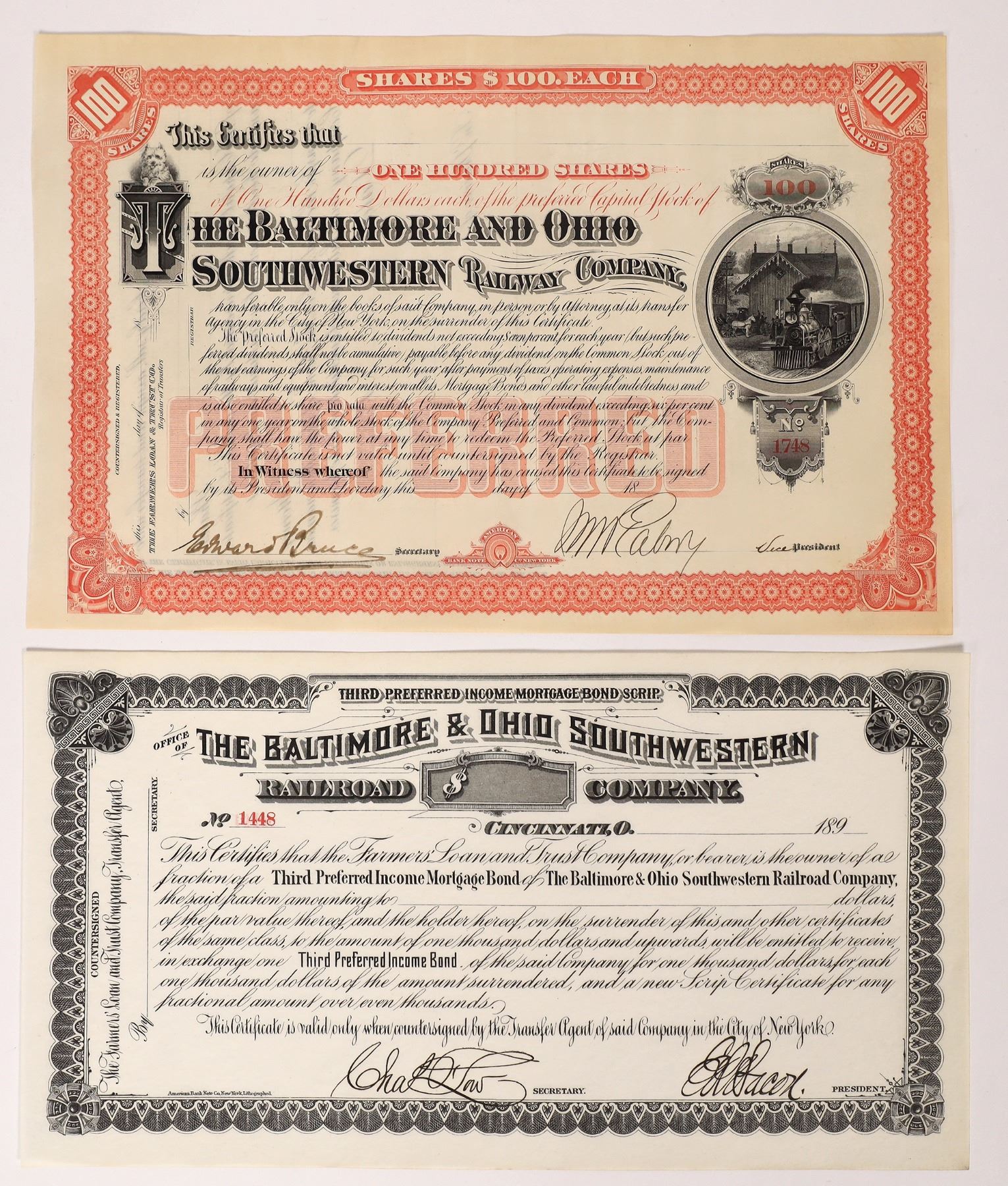 Baltimore and Ohio Southwestern Rail Road Company, 18xx, 100 shares, $100 ea. signed by vice president, unissued, but signed. A second cert 1890s, unissued but signed by E A Bacon as president.