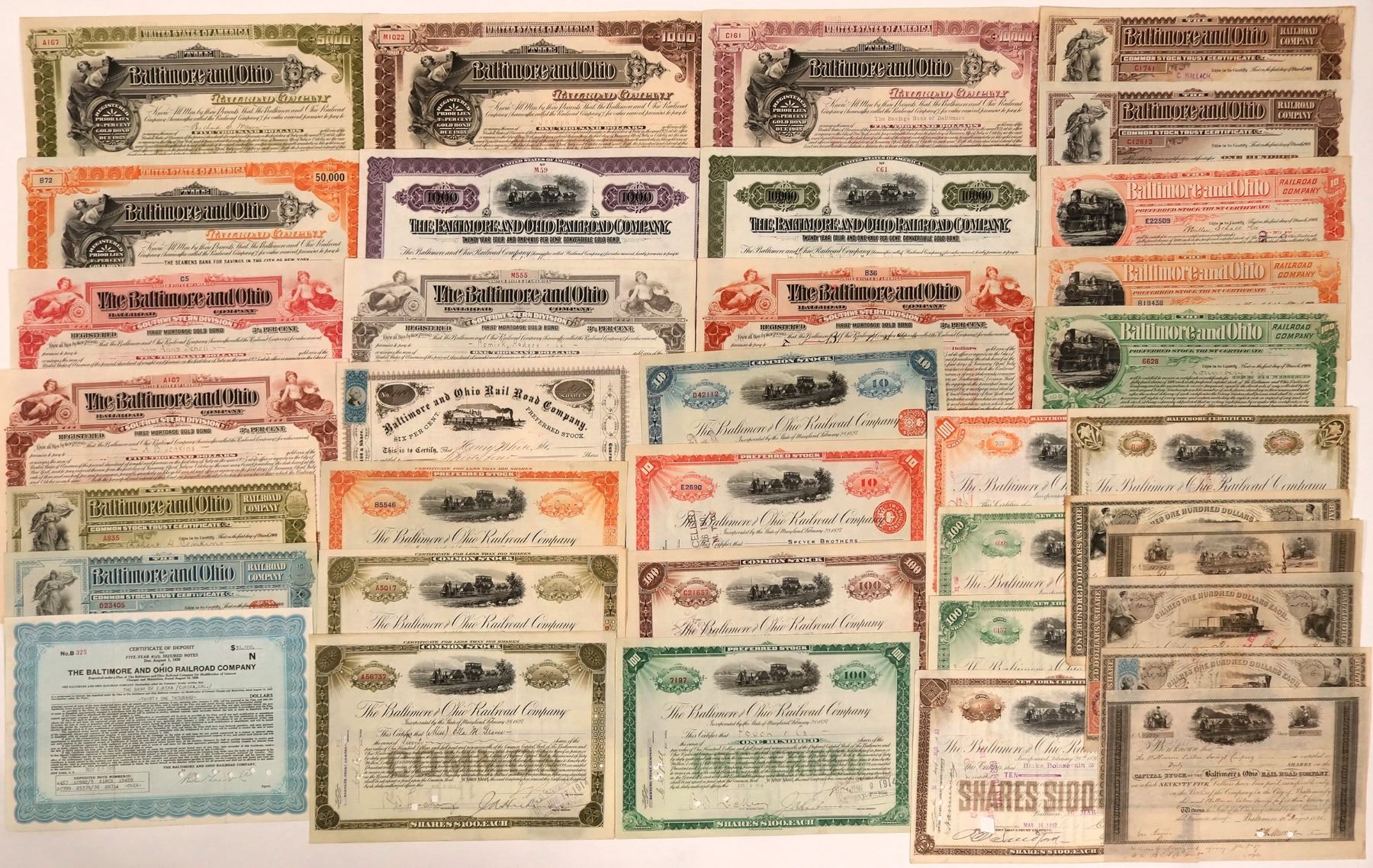 This is a great group of about 35 stocks and bonds from this famous railroad, issued all the way back to 1835. Many different colors and formats. The early date certificates include stocks issued in 1835, 1853 (2), 1867 and 1872. Also, a very nice 6% Pfd. stock issued in 1872 w. revenue stamp. Four common share certificates issued in th 1890's. Three Preferred Stock Trust Certificates issued in 1899 and 1900, with one not issued. Also, B & O Railroad Company, Southwestern Division gold bonds (4), Common stock Trust Certificates (2), 6 Bond certificates from early 1900's, a very unusual $50,000 Gold Bond payable to the Seamens Bank For Savings in the City of New York. Eight more common certificates issued between 1899 and 1914. Condition of the lot is average to very good condition. The certificates are generally cancelled.