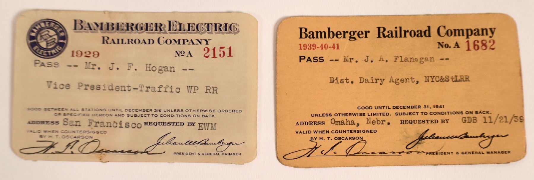 Lot of 2 different. This railroad started in 1891 as the Great Salt Lake & Hot Springs Railway. Then became Salt Lake & Ogden Railway in 1896, and the Bamberger Electric Railroad in 1917. 1) Pass no. 2151, issued for 1929 to JF Hogan, vice president traffic Western Pacific RR. Purple print. 2) Pass no. 1682, issued for 1939-41 to JA Flanagan. Black print on yellow/brown paper.