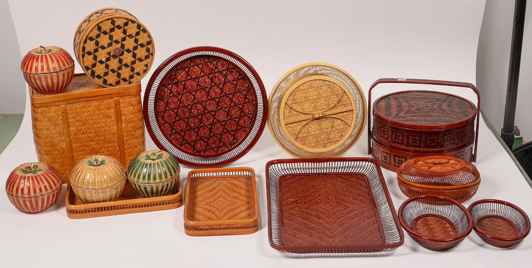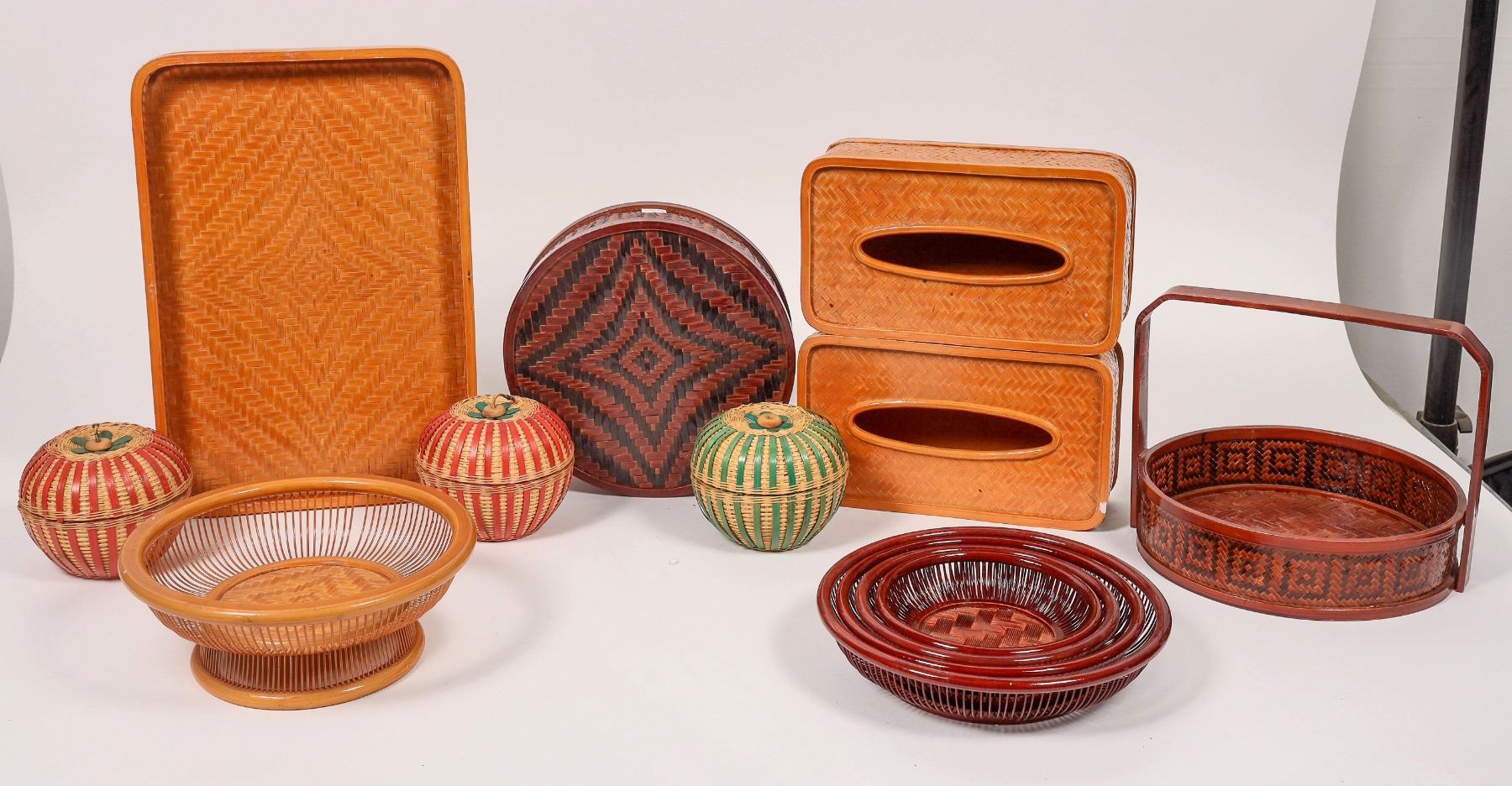 A large assortment of bamboo baskets and servers in various shapes and sizes. All in near new condition. Please see photos for more details.