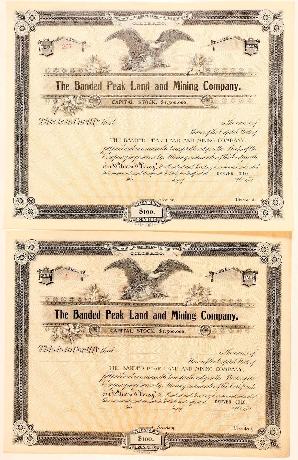 Lot of 2 unissued including certificate No. 1. 1890s Denver dateline. Eagle vignette. "The precious metal mines of the county are practically an undeveloped resource. Each year the eastern portion, or, in other words, the western slope of the Conejos range, is the scene of more or less prospecting and desultory mining. A large portion of this territory has, until within a few years, been closed to prospectors. It is known as the Tierra Amarilla grant. The northern portion of this grant, embracing some sixty thousand acres, is owned by The Banded Peak Land and Mining Company. Willard Teller, president; E. B. Morgan, secretary, Denver, Colo. This company has formulated a set of mining rules and regulations for those desiring to prospect or mine that are liberal and insure good title to property. The regulations, in the main, conform to state laws governing mining operations." [Ref: Report of the State Bureau of Mines, 1901-02, pg.17] () Ken Prag Collection