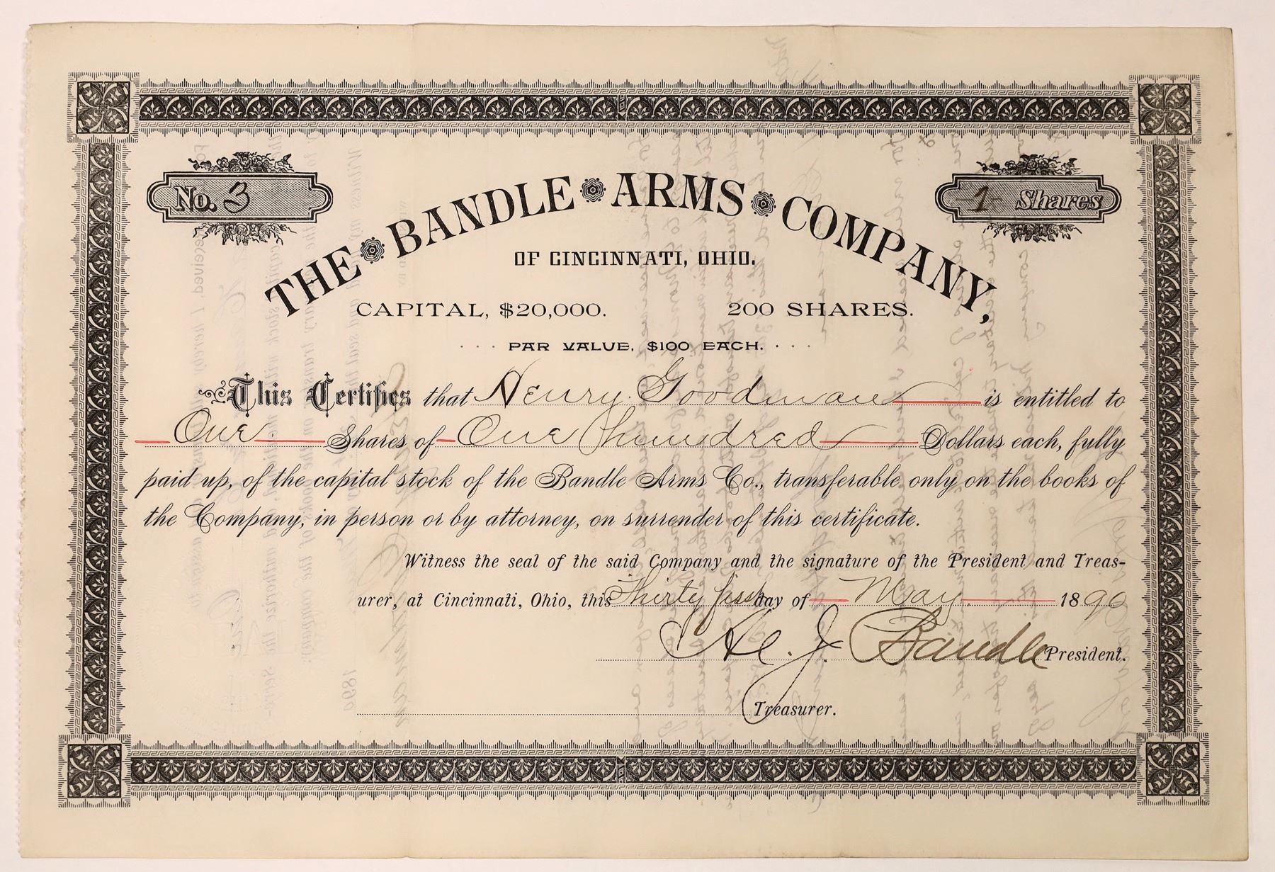 A unique and rare stock certificate issued by The Bandle Arms Company. It is for 20 shares at $100 per and made out to Henry Goodman, dated May 31, 1890 and signed by J. Bandle, president of the company. it is endorsed on the reverse and also signed by future company president G. Morris Crawford.