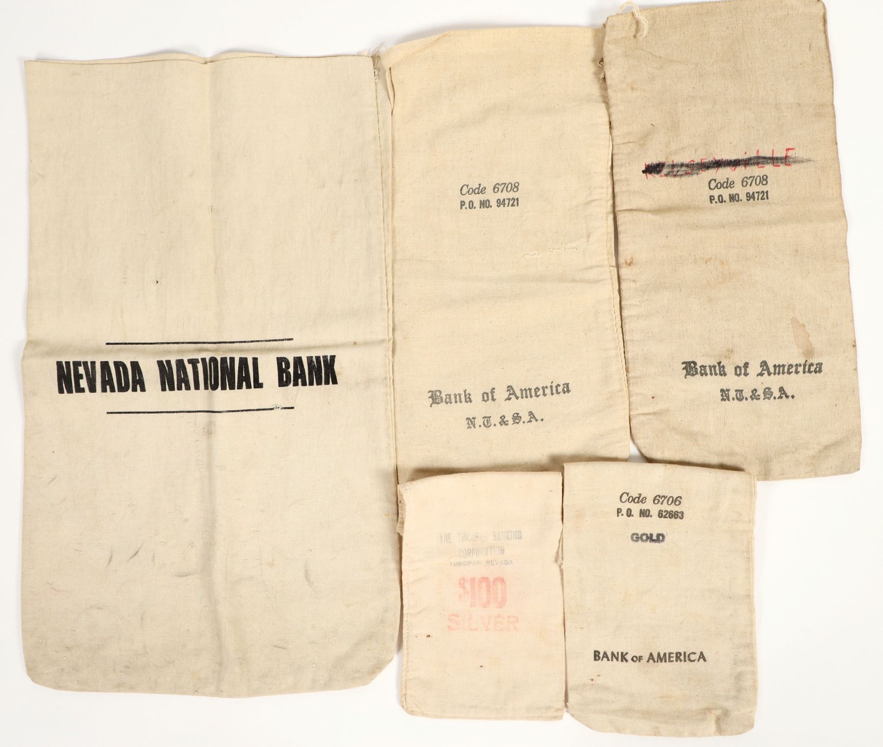 Lot of 5. Rare, The Tonopah Banking Corp. bank bag stamped "$100 Silver". c1900. Same company that installed the safe in the Mizpah Hotel built in 1907, still there today.. Also included are four other bank bags: Nevada National Bank, Bank of America marked "GOLD" and two other B of A bags. All in very good cond.