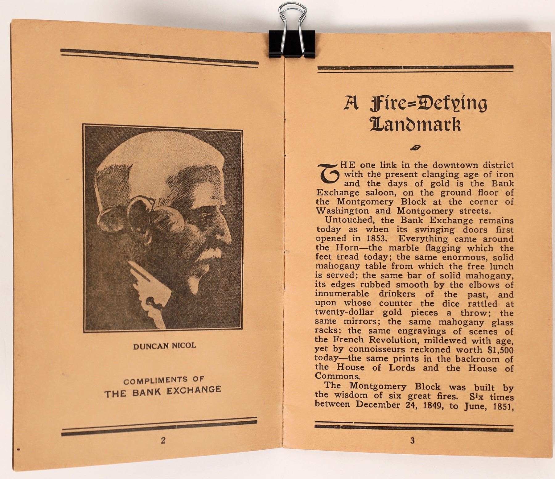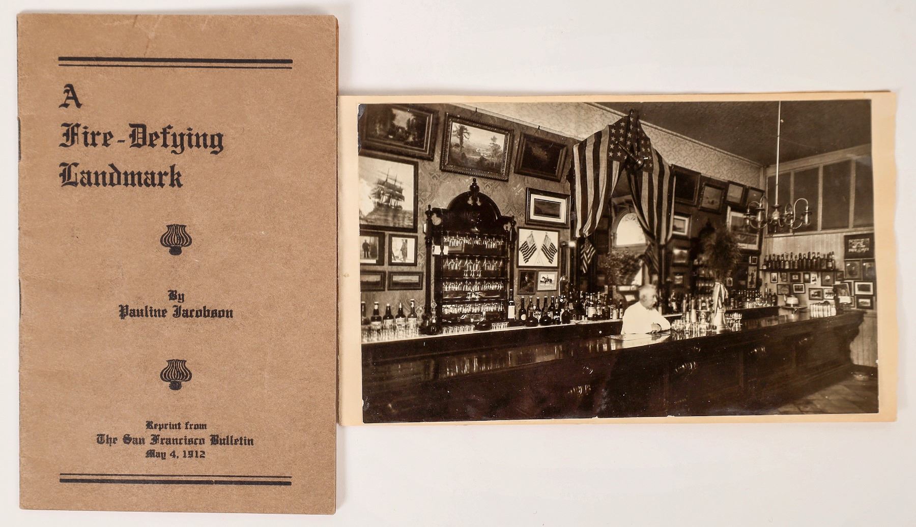 Two relics of San Francicoís famous Bank Exchange Saloon. It was the place were the ìPisco Punchî gained great notoriety. Pisco Punch is considred San Francisco's own drink! On cover is a photo of the saloon. Inside the foldout is a note. Also a booklet on the Bank Exchange in 14 pages. California San Francisco
