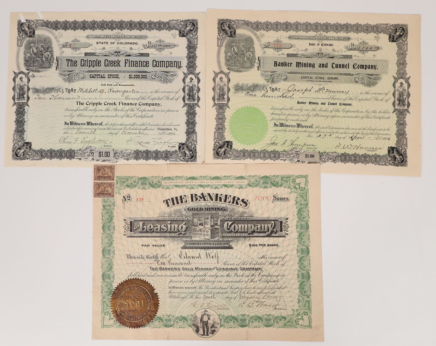 3 issued Colorado mining stocks with bank and finance themed names. 1906 Banker Mining and Tunnel. 1899 Bankers Gold Mining and Leasing Co. with great bank teller and cage vignette-4x .5" seam tears. 1896 Cripple Creek Finance Co., probably based in Philadelphia and investing in Cripple Creek mines-2 corner chips, lower right dog ear and stain. Please inspect. Colorado Herzog Collection