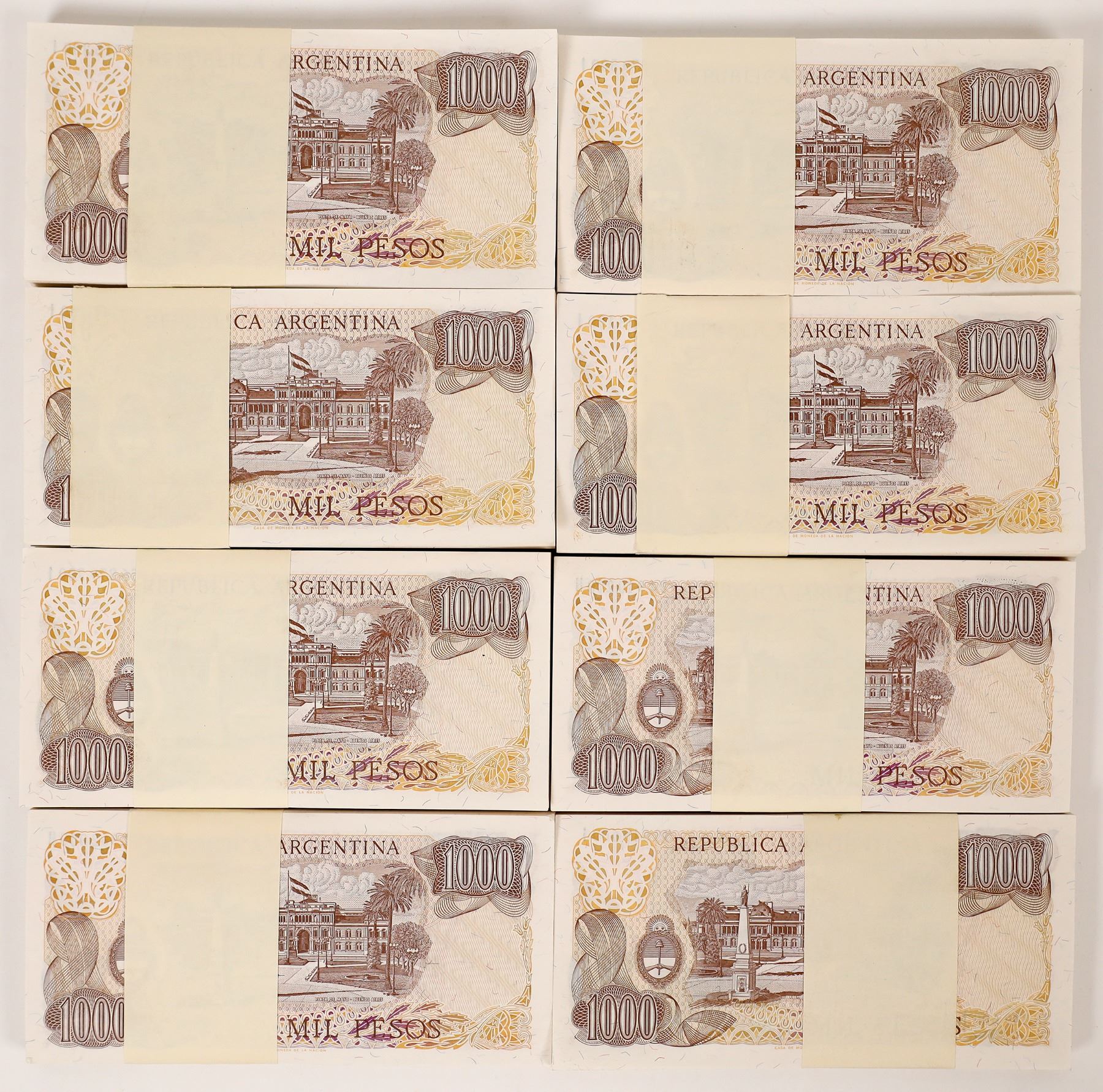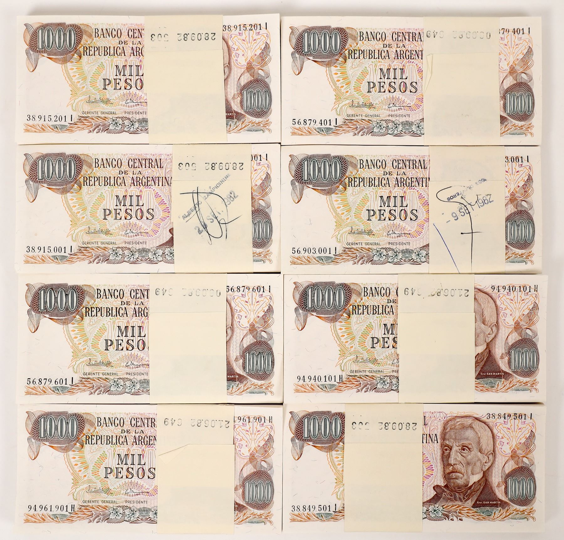 Bank notes of Argentina: eight packs of 100 crisp uncirculated sequentially numbered notes: Pick#304c (1976-83) Bank of Argentina 1000 Pesos. Argentina