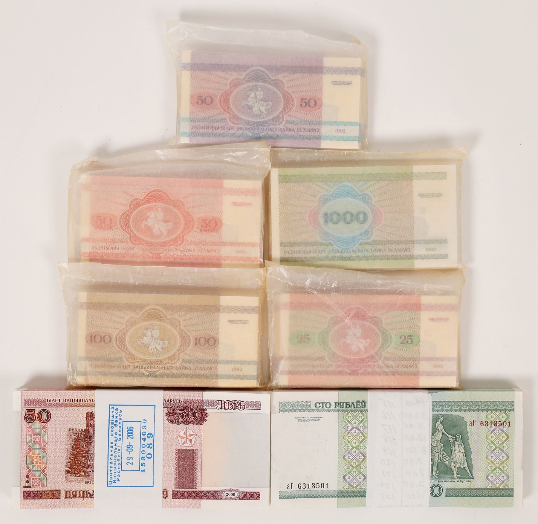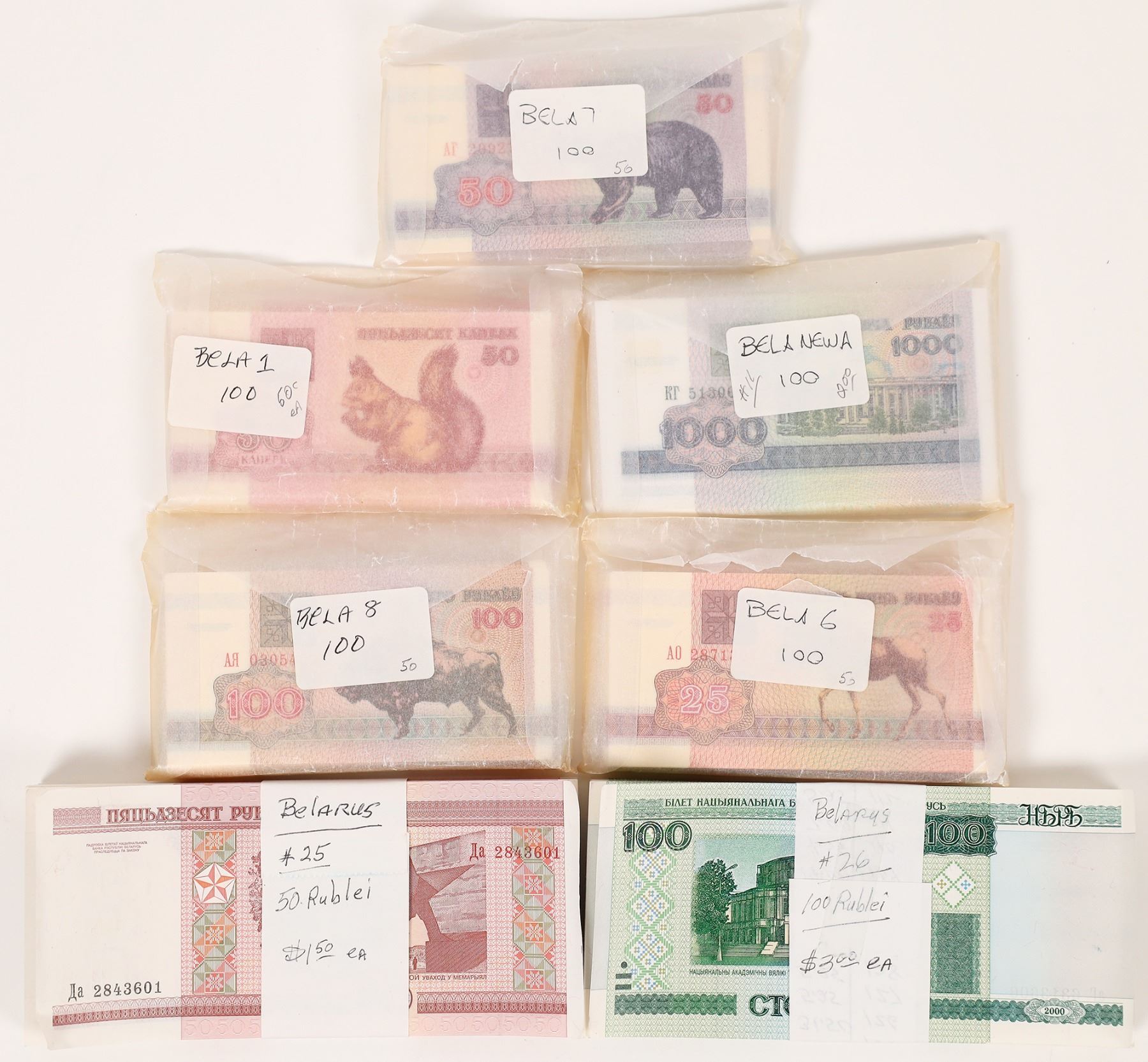 Crisp uncirculated bank notes from Belarus: Pick#1,6-8,11, 25-26; Sokapeck 25,50, 100 1000, Rublei 50 and 100 (1992-2000). 100 each of seven different notes. Belarus