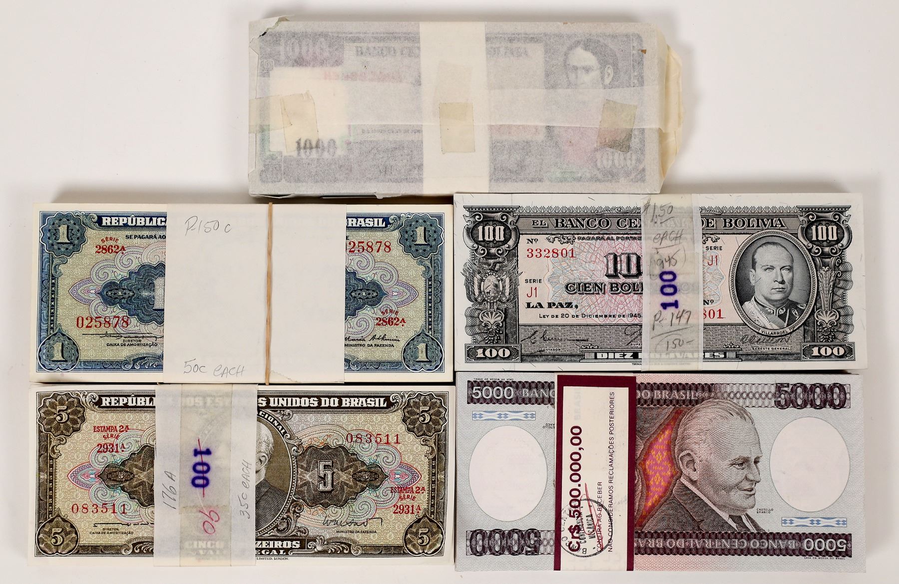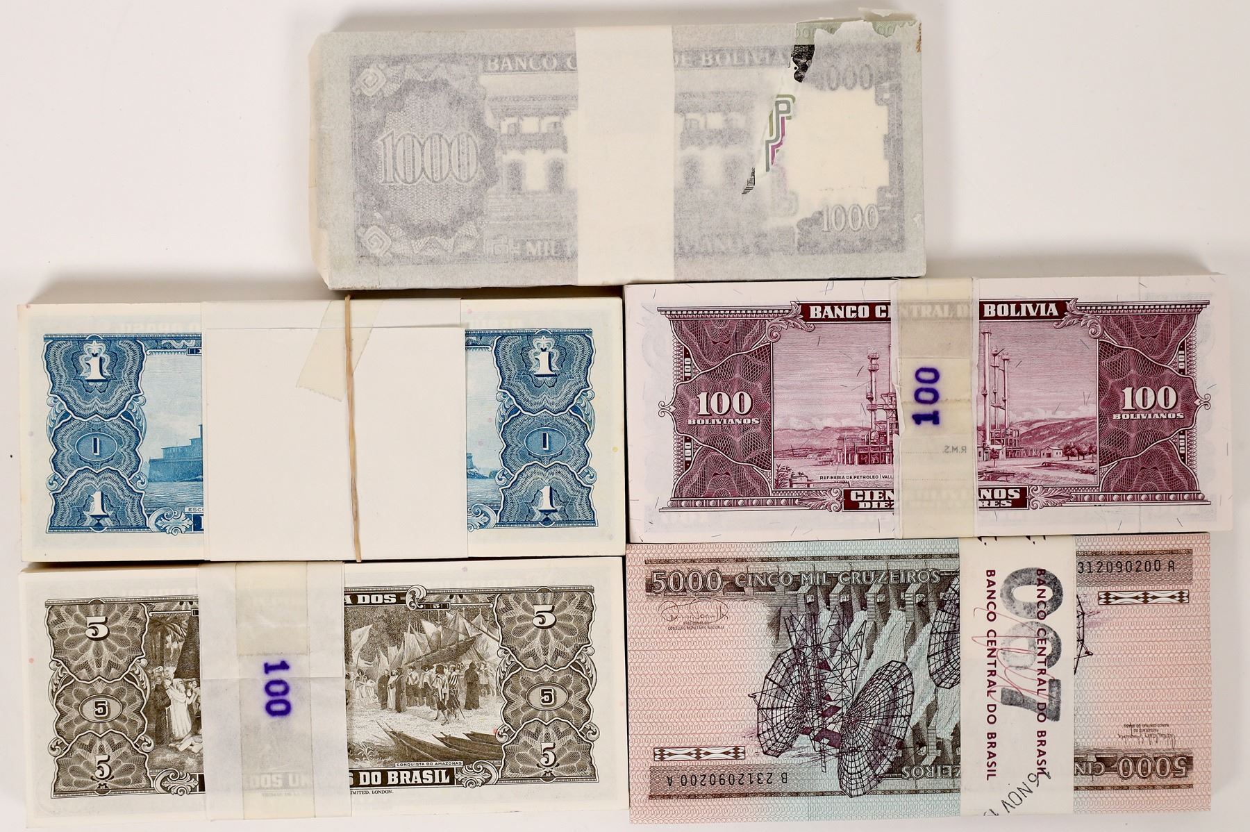 Bank notes of Bolivia & Brazil: five packs each with 100 crisp uncirculated sequentially numbered notes. 1) Pick#147: Bank of Bolivia 100 Bolivares (Law 1945); 2) Pick#167a: 1000 Pesos Bolivianos (1982); 3) Pick#150c: Bank of Brazil 1 cruzeiro (1954-58); 4) Pick#176a: 5 cruzeiros (signature 11/1962); 5) Pick202d: 5000 cruzeiros (signature 22/1985). Brazil