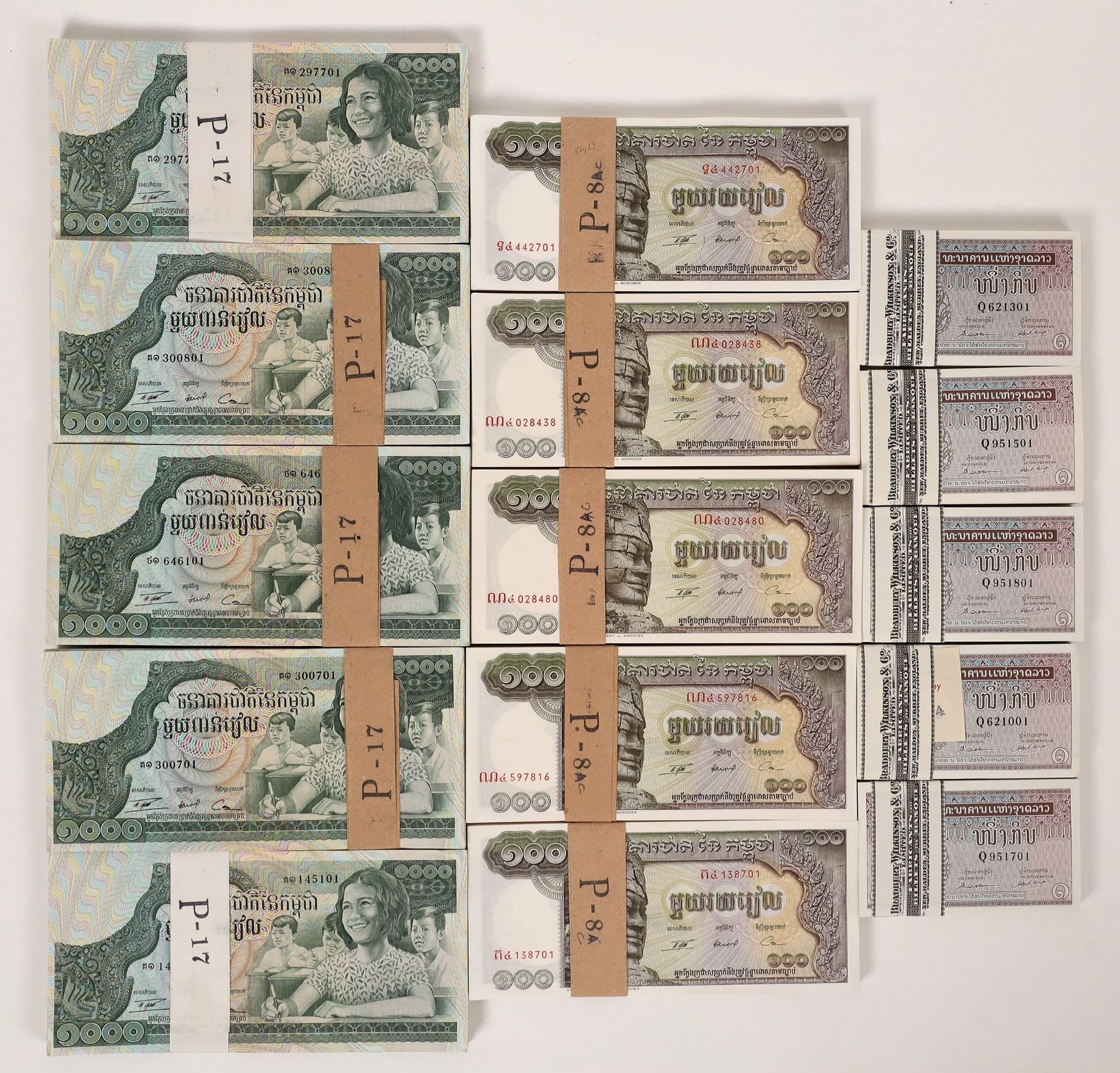 Crisp uncirculated bank notes of Cambodia Pick#8C 100 riels (1957-75); Pick#17 1000 riels (1973); and Laos Pick#8A 1 kip (1962), 500 pieces each.