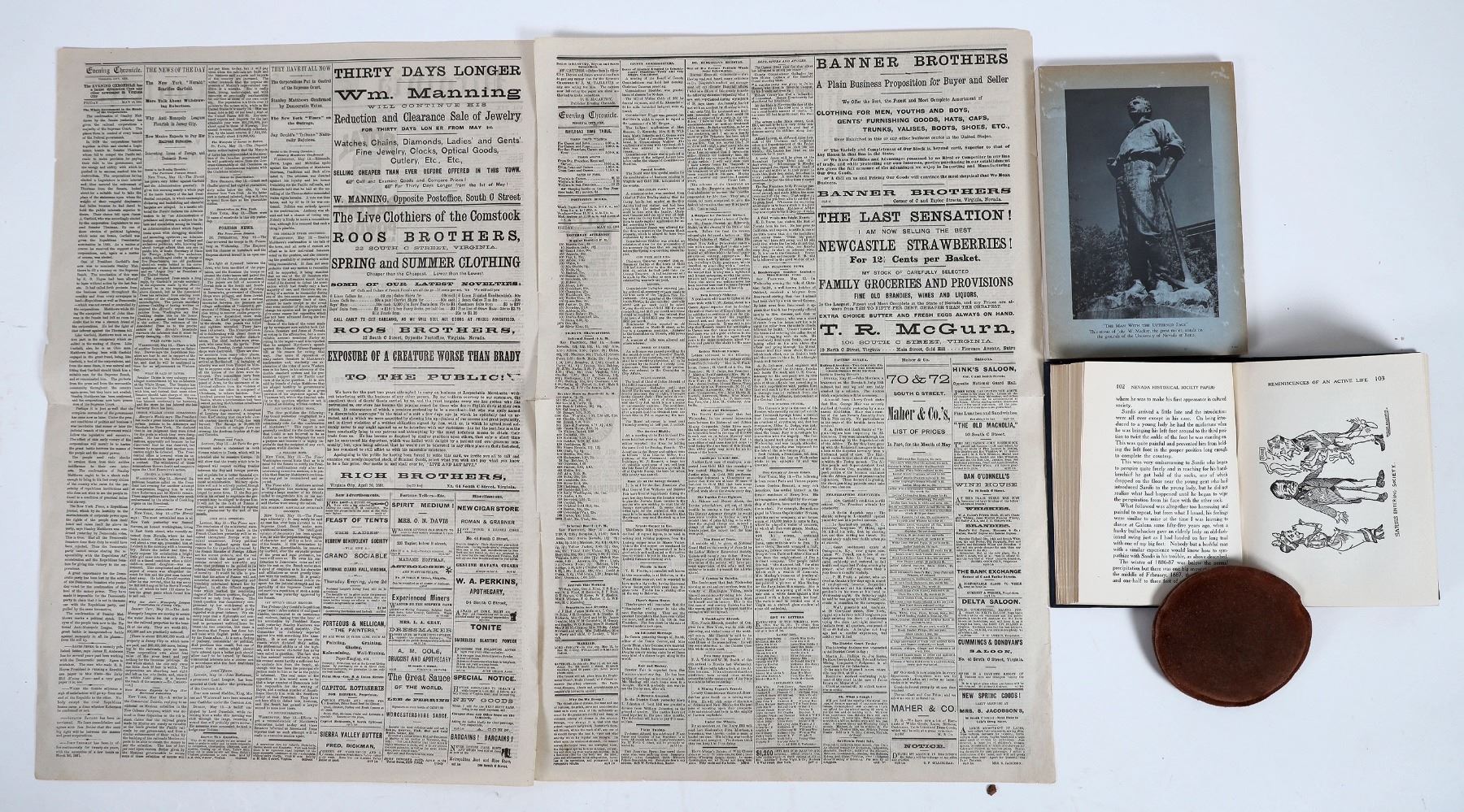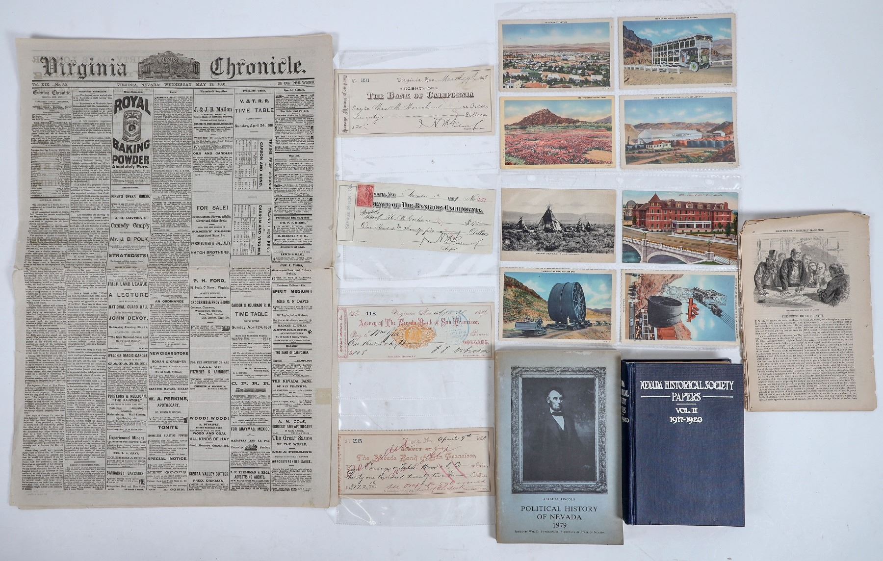 Lot of 16. Virginia Chronicle dated 1881 (Virginia CIty) Bank receipts dated 1876 & 08, Color postcards, Harpers Magazine article on Reese River , Book Nev. Hist. Soc Papers 1917-1020 286 pts very goos cond, paperback Plotical Hist. Of Nev 1979 251 pts, very good cond.