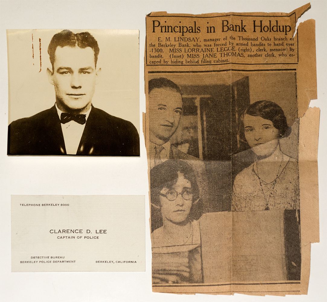Four items relating to a bank robbery that took place in Berkeley in 1930. 1) Newspaper clipping showing bank employees who were present for hold-up. 2) 3" x 3" photograph of the robber, identified on the back as Jerome T. Read. 3) A business card from Clarence D. Lee, Captain of Police in Berkeley, with a typed message on reverse: "Please look at this now and then so you wont forget the face. Thanx." 4) Small handwritten note: "Newspaper clippings to Donald B. Reese" in Beverly Hills. Newpaper articles indicate Read, also known as Palmer, escaped prison in Florida.