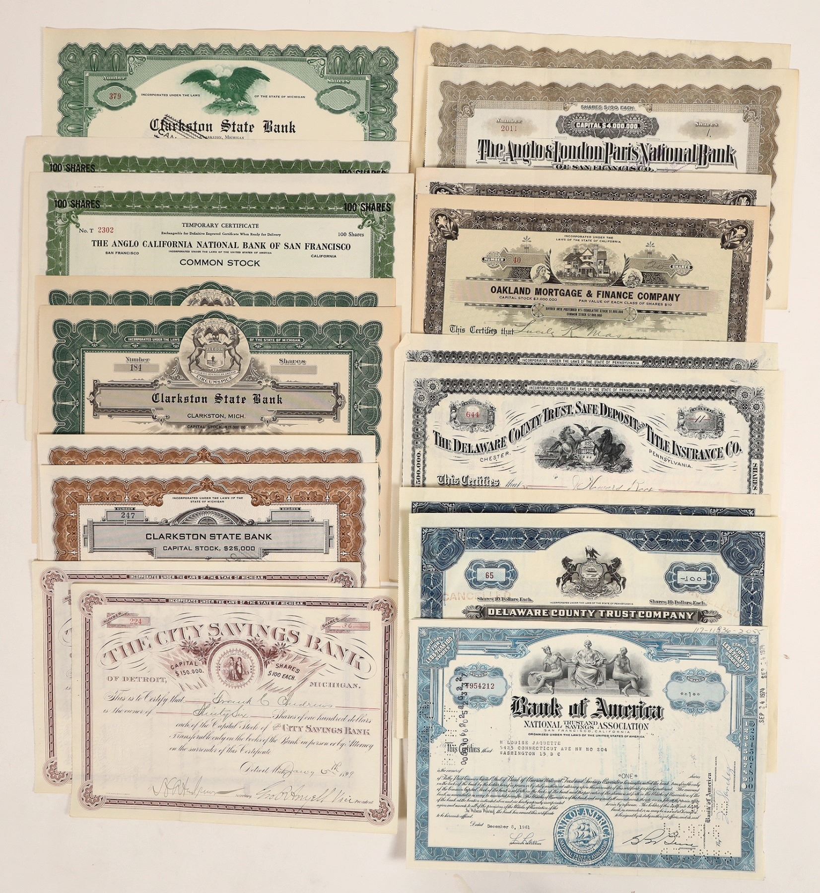 20 bank stocks in pairs, c. 1898-1961. City Savings, Clarkston State-3 styles, Bank of America, Anglo California of SF, Anglo & London Paris National, Oakland Mortgage & Finance, Delaware County Trust in 2 styles.[ Ken Prag Collection