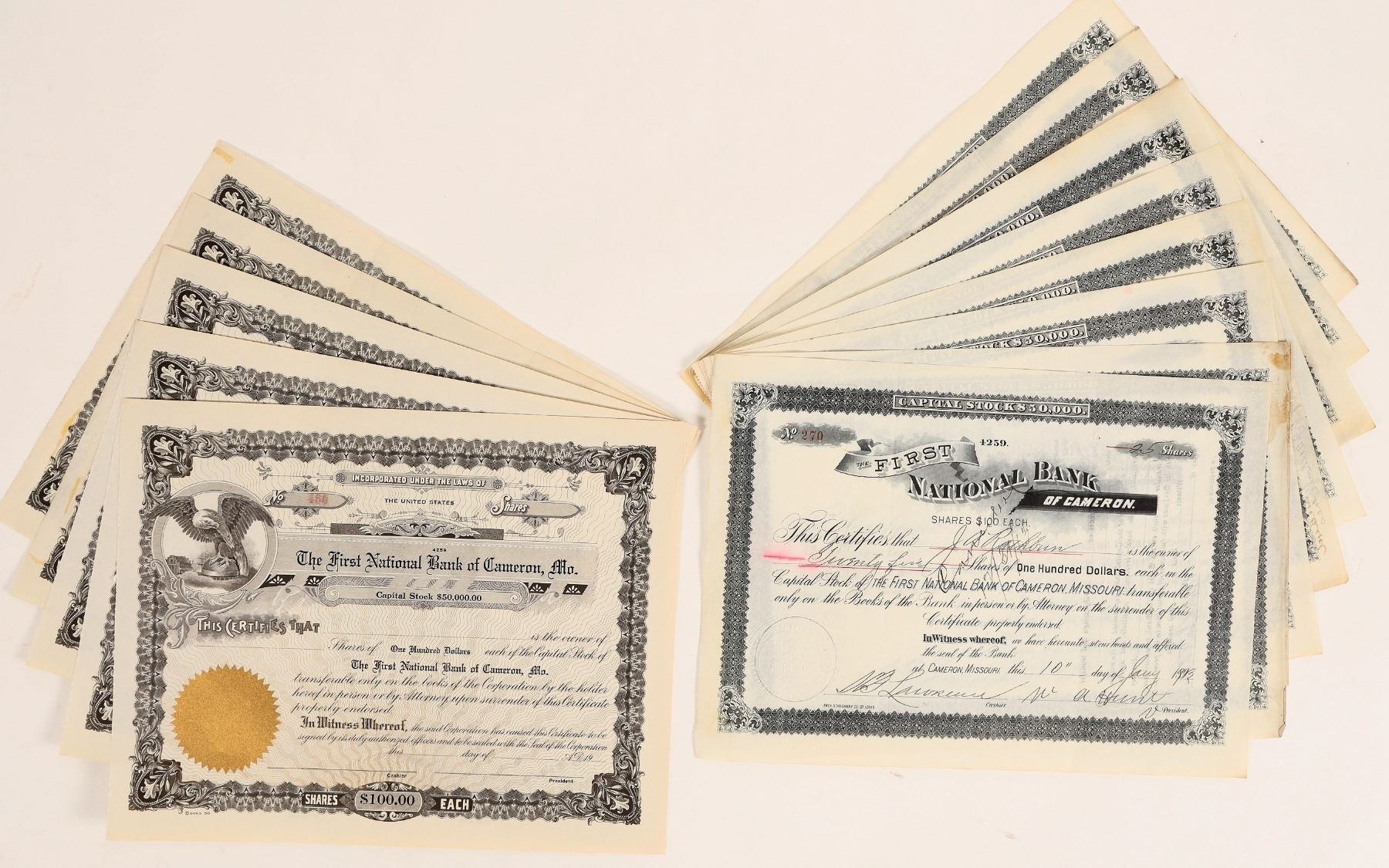 A collection of 14 stock certificates from the First National Bank of Cameron, Missouri, c1890-1930s. Two different styles included, with nine of them c1890-1917, & five of them 19XX-1940. Three unissued, the rest issued & canceled.[ Missouri Ken Prag Collection