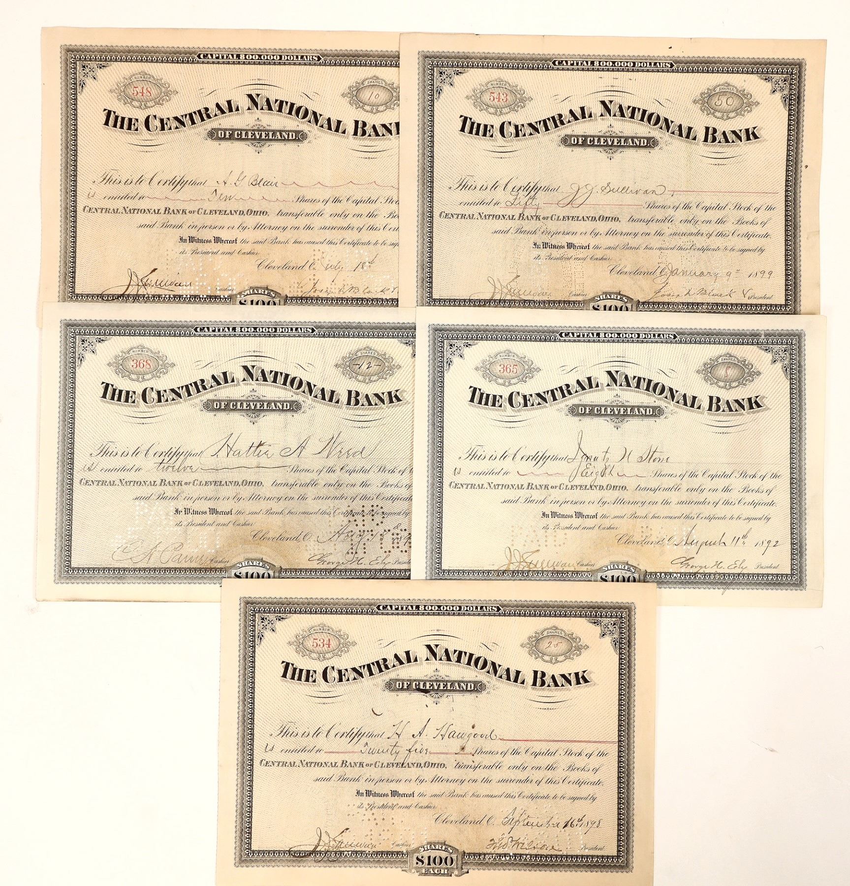 A group of 5 stock certificates from Central National Bank of Cleveland, Ohio, c1892-98. All issued & canceled.[ Ohio Ken Prag Collection
