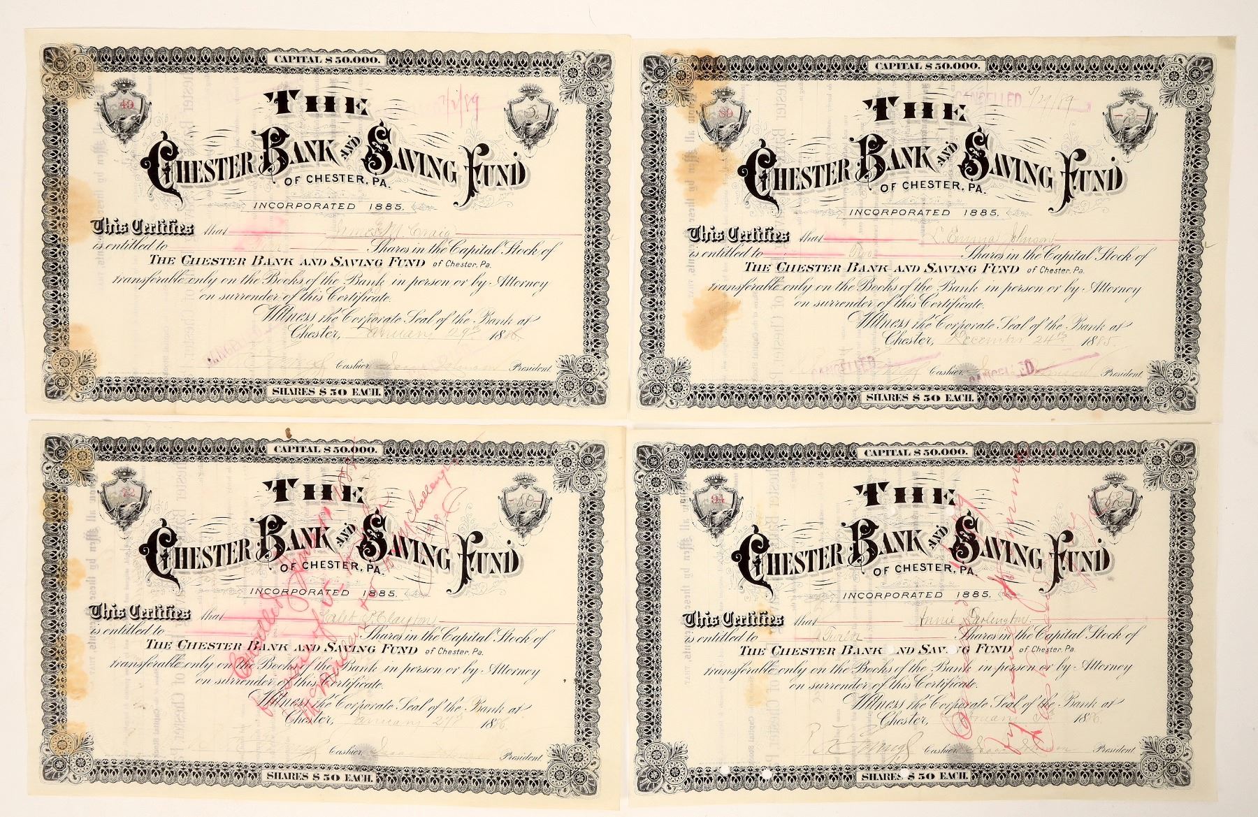 A group of 4 stock certificates from the Chester Bank & Saving Fund, of Chester, Pa., c1885-86. All issued & canceled. Embossed seals.[ Chester Pennsylvania Ken Prag Collection
