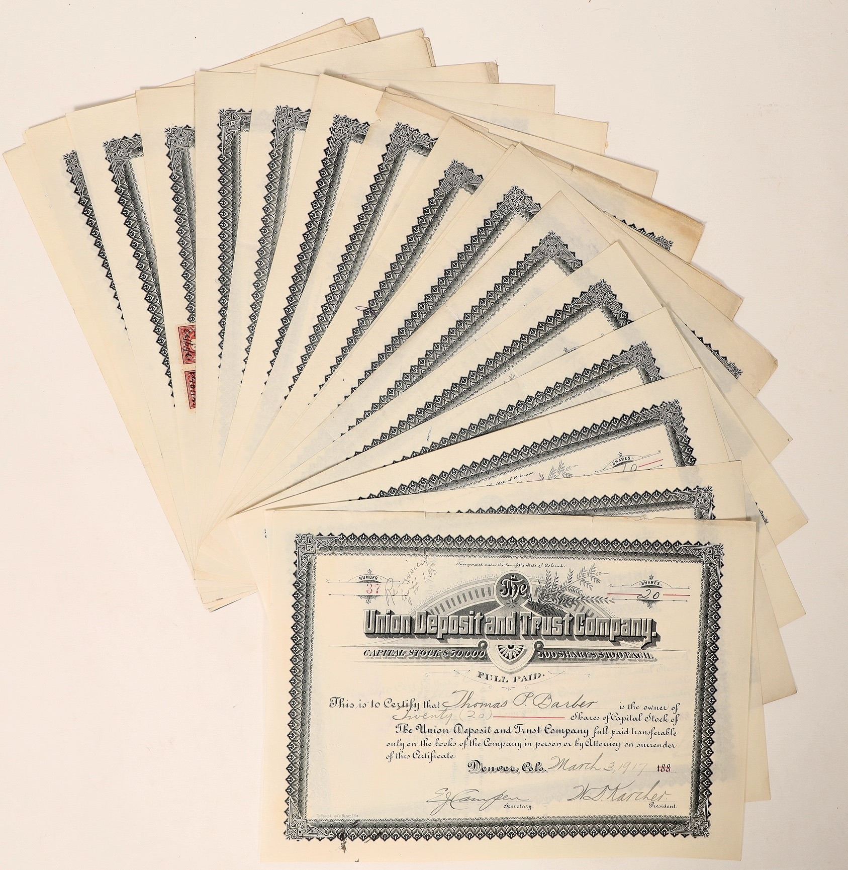 A collection of 25 Union Deposit & Trust Company, Denver, Colorado, stock certificates, c1888-1923. All issued & canceled.[ Denver Colorado Ken Prag Collection