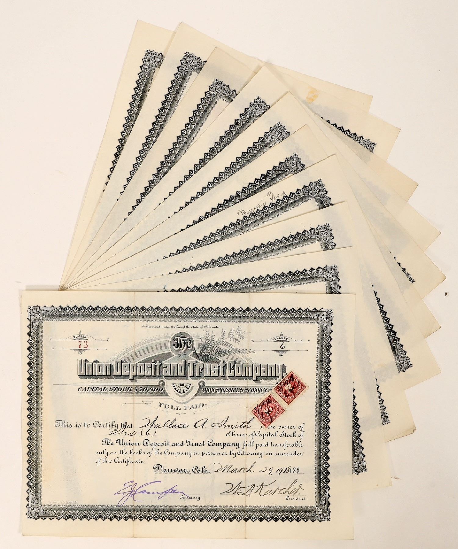A collection of 10 Union Deposit & Trust Company stock certificates, from Denver, Colorado, c1908-23. Seventeen revenue stamps. All with embossed seal & issued. Some canceled.[ Colorado Ken Prag Collection
