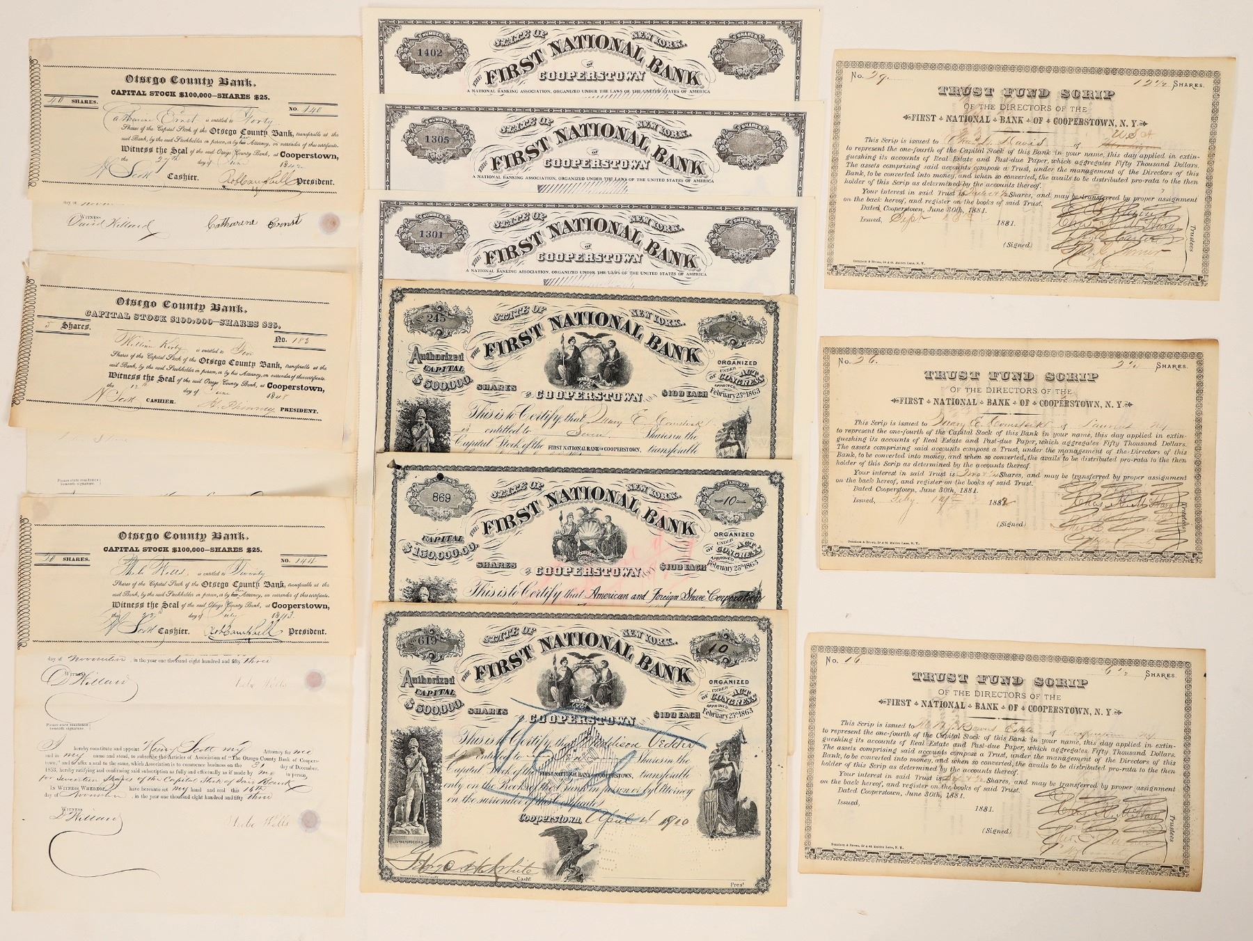 A dozen stock certificates from banks in Cooperstown, N.Y., c1842-19XX. Includes 4 different: Trust Fund Scrip, First National Bank of Cooperstown, N.Y., 1881-82 (3); Stock Certificates, First National Bank of Cooperstown, 1881-1927 (3); Stock Certificates, First National Bank of Cooperstown, unissued & canceled, 19XX (3); Stock Certificates, Otsego County Bank, receipts attached, 1842-48 (3).[ Cooperstown New York Ken Prag Collection