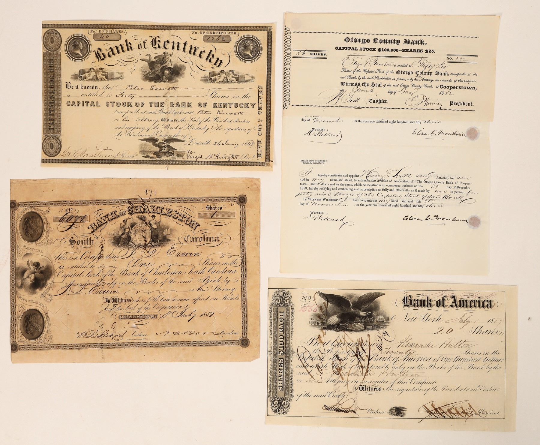A group of 4 early stock certificates from banks, c1843-57. Includes: Bank of America, NY, 1857; Bank of Charleston, South Carolina, 1857; Bank of Kentucky, c1843; Otsego County Bank, Cooperstown, NY, 1852. All issued & canceled.[ Ken Prag Collection