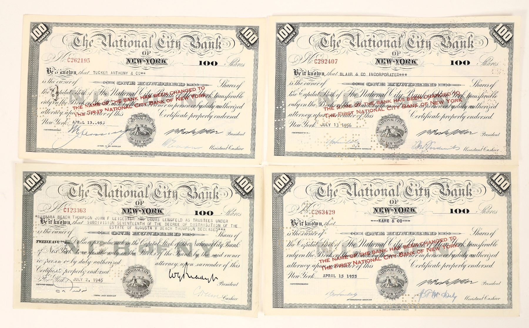 A mini collection of 4 stock certificates from the National City Bank of New York, c1945-56. Issued & canceled, one with six revenue stamps on verso.[ New York Ken Prag Collection