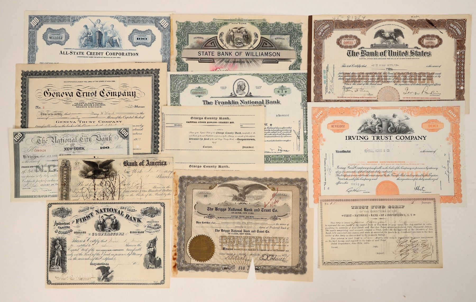 A collection of 12 bank stock certificates from New York, c1859-1962. Includes: Bank of America, NY, 1859; Trust Fund Scrip, Cooperstown, NY, 1881; Otsego County Bank, Cooperstown, NY, 18XX (2 unissued); The Bank of United States, (2nd page Bankus Corp.), 1930; Geneva Trust Co., NY, 1919, 4 revenue stamps; etc. Mostly early. Most issued & canceled.[ New York Ken Prag Collection