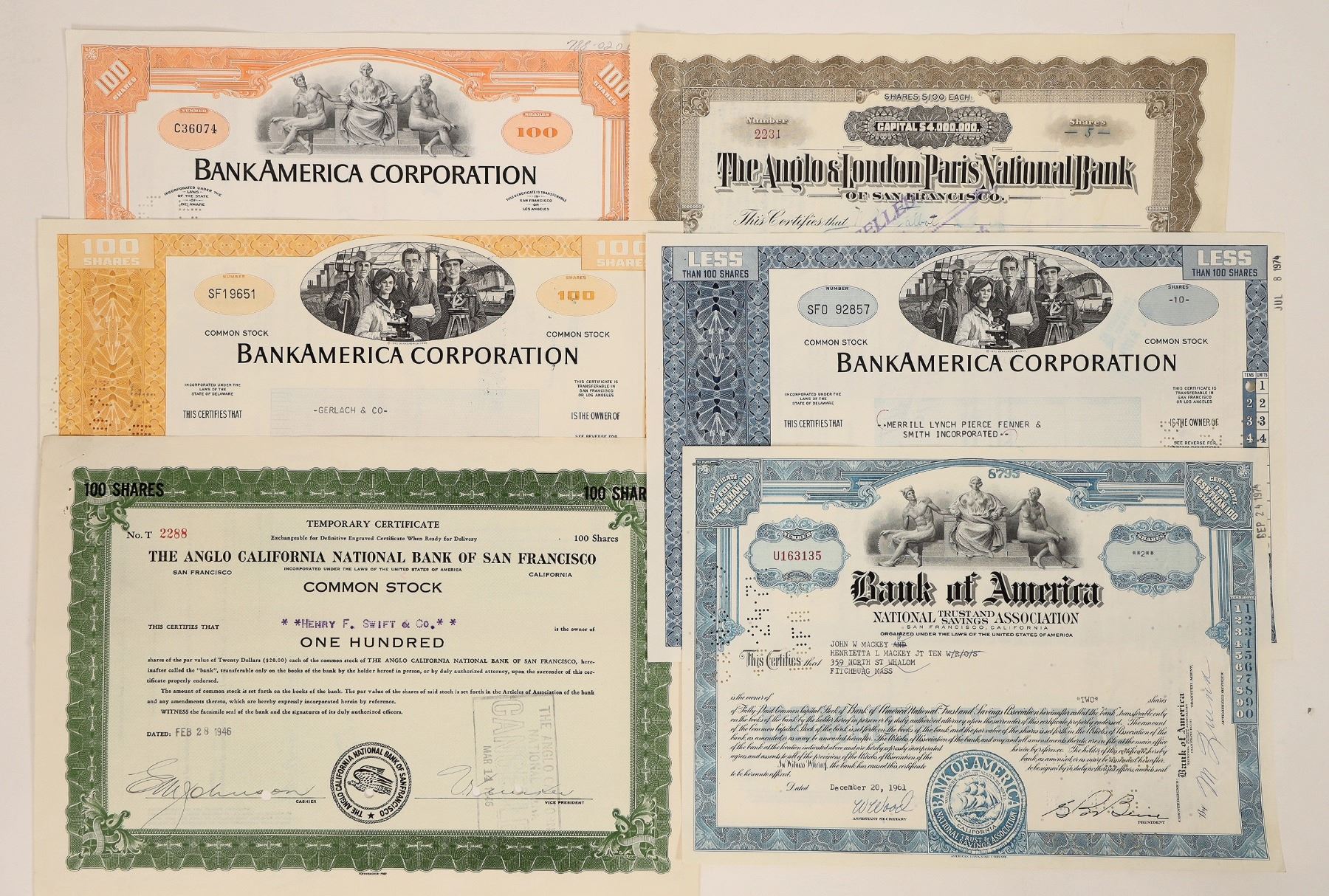 A mini collection of 6 bank stock certificates from San Francisco, c1917-74. Includes: Anglo & London Paris National Bank, 1917; Bank of America (4 different) 1961-74; & Anglo California National Bank of SF, 1946. All issued & canceled.[ Ken Prag Collection