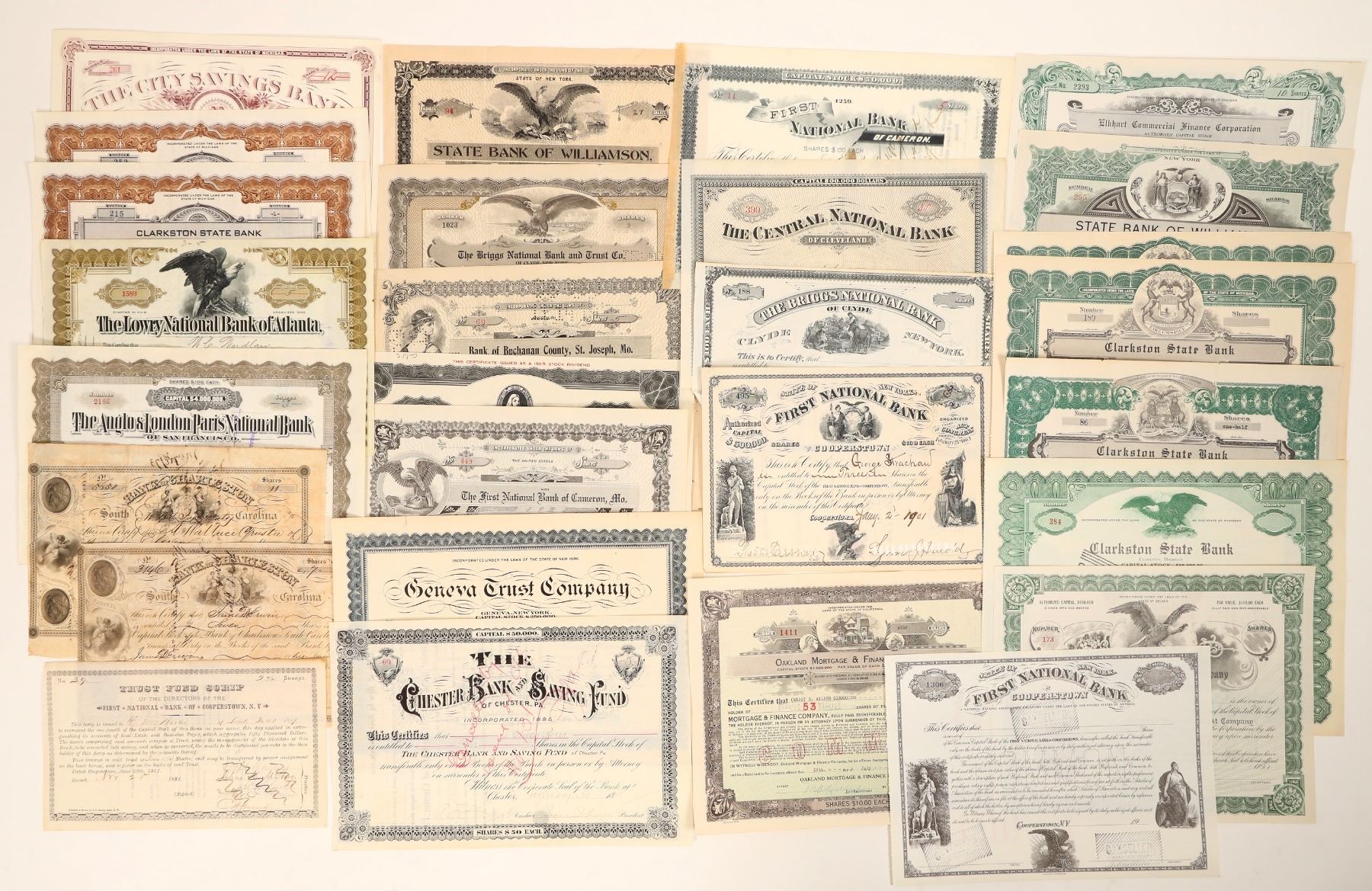 A collection of 28 bank stock certificates with cities or towns in their names, c1843-1940. Includes: Clarkston State Bank, Michigan, 1929-40 (6) (3 different); Anglo & London Paris National Bank of San Francisco, 1917; Bank of Charleston, South Carolina (2), 1843 & 1850; First National Bank of Cooperstown, N.Y., 1901; Trust Fund Scrip of the Directors of the First National Bank of Cooperstown, N.Y., 1881; Briggs National Bank of Clyde, N.Y., 18XX, etc. The remainder are all different, no dupes. Some are issued, others blank, some canceled.[ Ken Prag Collection