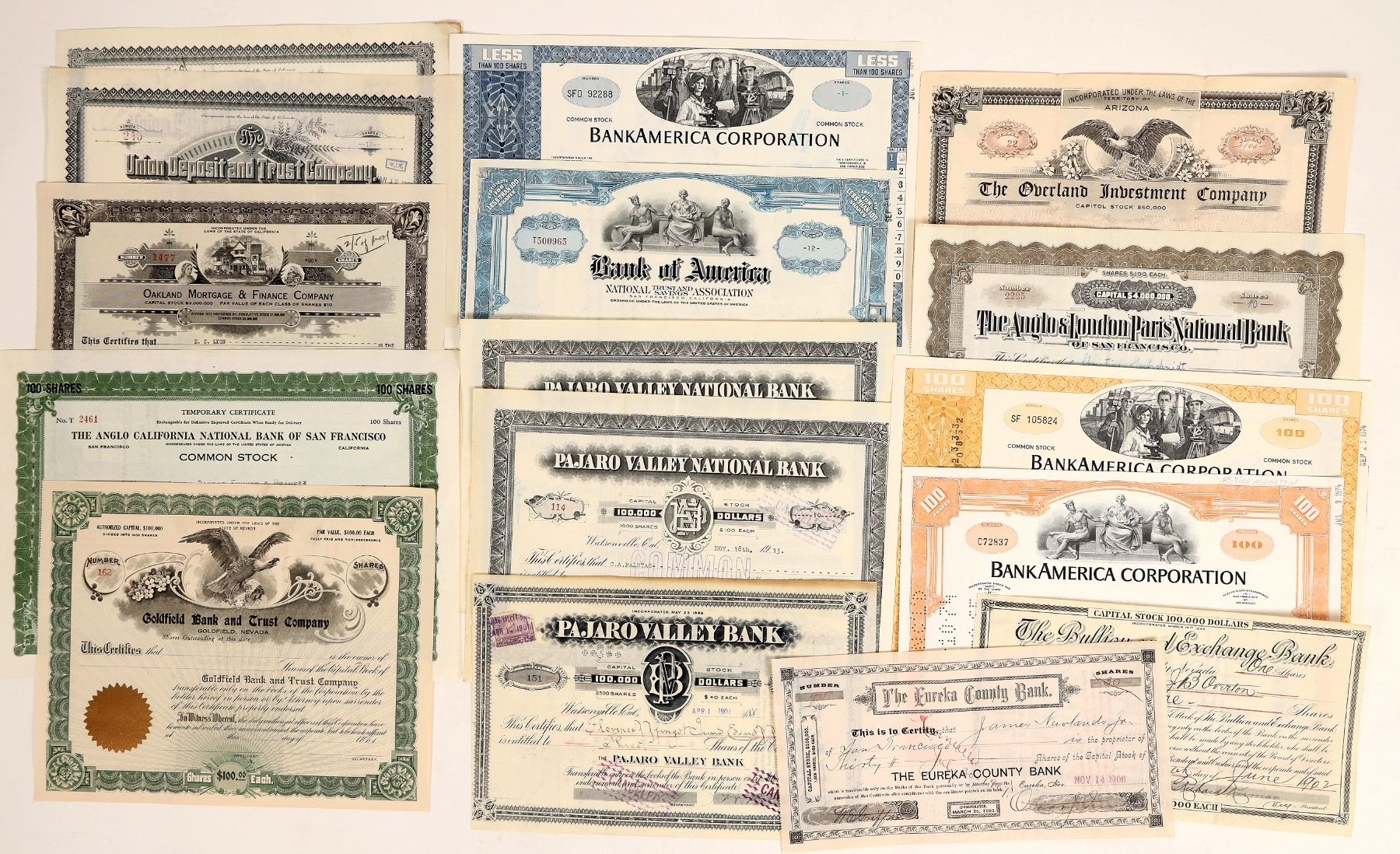 A collection of 16 bank stock certificates from U.S. Western states, all different, c1901-74. Mostly early. Includes: unissued Goldfield Bank & Trust Co., Nevada; the Bullion & Exchange Bank, Carson City, Nev., 1902; Eureka County Bank, Nev., 1906; Union Deposit & Trust Co., Denver, Colo., (2) 1917 & 1923; Oakland Mortgage & Finance Company, Calif., 1940, etc. One unissued, the rest issued & canceled.[ Ken Prag Collection
