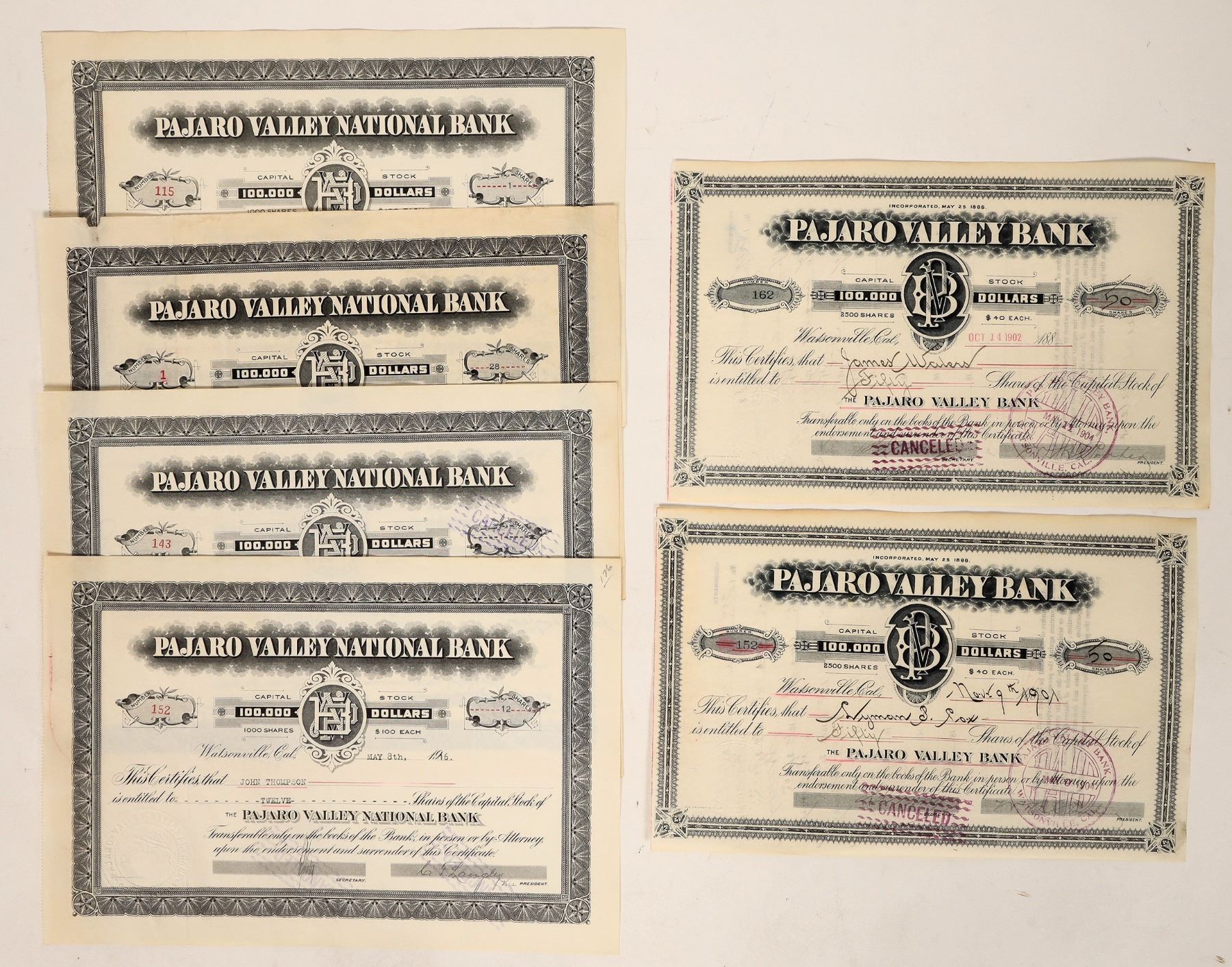 6 Pajaro Valley Bank stocks in 2 styles, c. 1888-1916.[ California Ken Prag Collection
