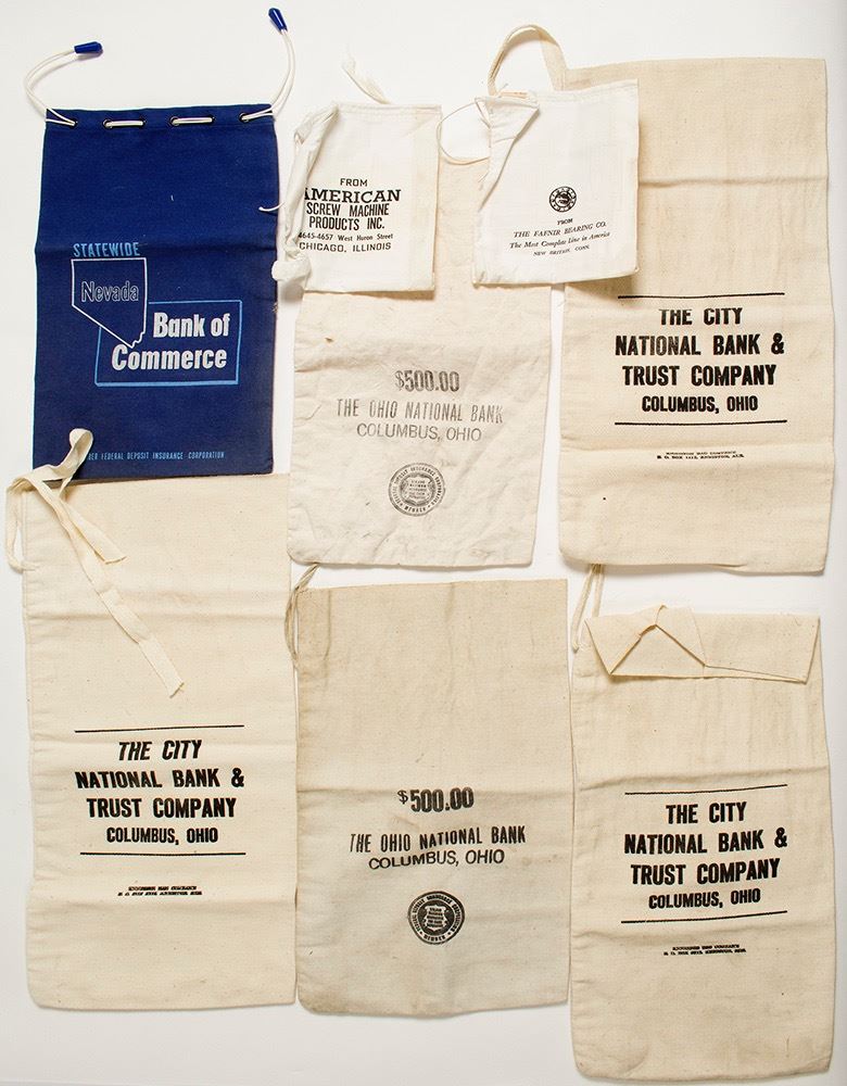 Collection of eight cloth coin bags. Seven are from Columbus, Ohio, the other from Nevada. Includes two $500 half dollar bags from Ohio National Bank. All excellent condition. HWAC# 49140 Date: Location: