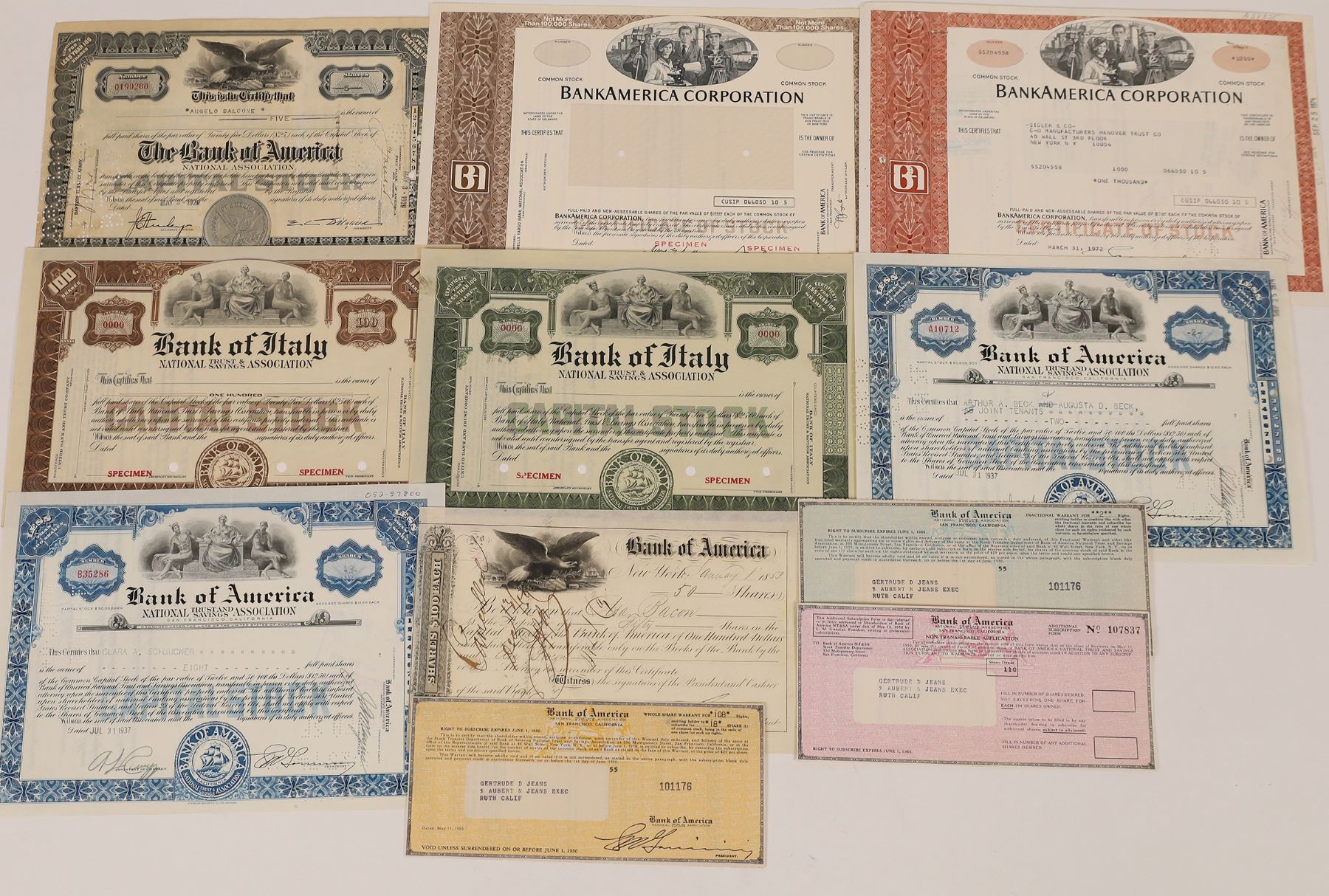 Lot of 11. Most different. Stocks include: Bank of America (1853, New York); Bank of America National Association (1928 and 2x1937); BankAmerica Corporation (specimen plus 1972); Bank of Italy (two different specimens). Plus 3 Bank of America warrants c.1950.