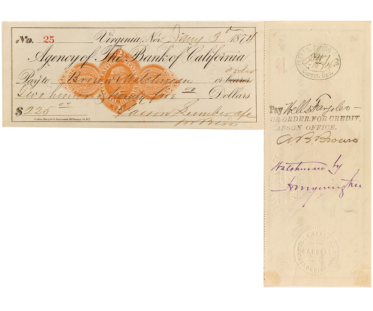 Payable to Brown & Watchman. Signed by DL Bliss for the Carson Lumber Company. Back has been signed by H. M. Yerington for Watchman. Revenue imprinted RN D1. Wells Fargo & Co. Carson City stamp on back.