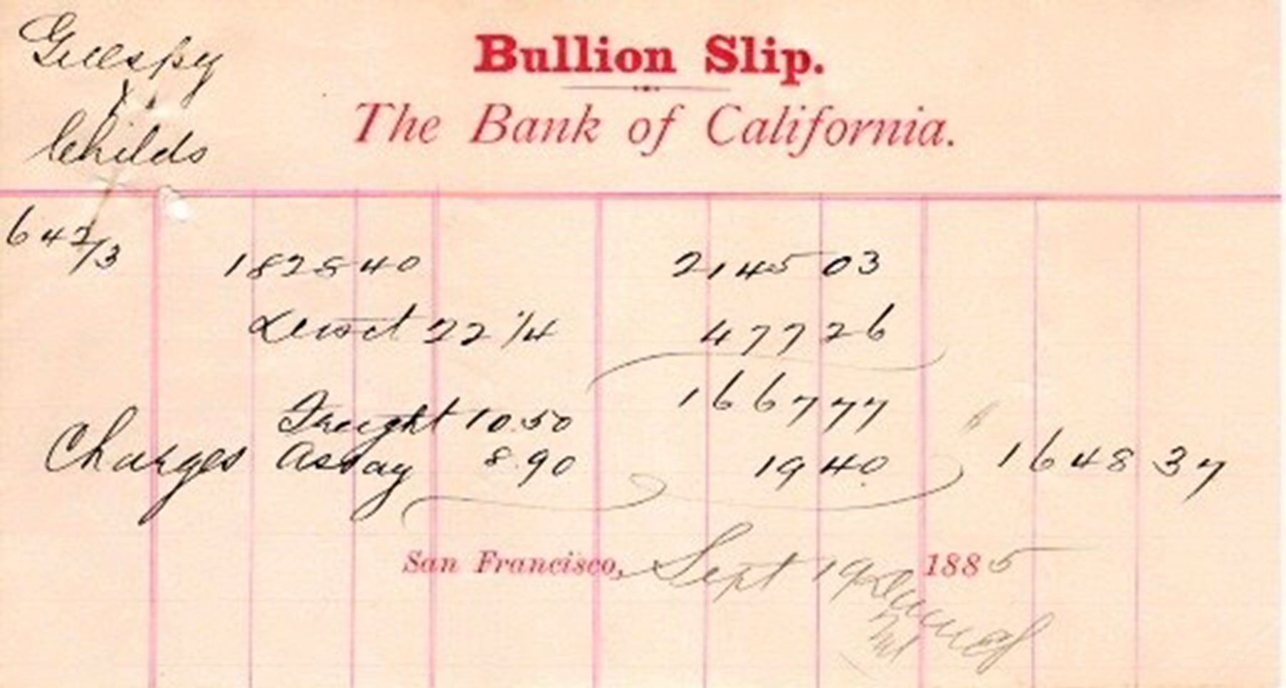 Bank of California Bullion Receipt Sept. 19, 1885, San Francisco, CA - No. 642/3 bullion receipt. X-rare (1-3 known) probably R8. Receipt issued for bullion bar submitted to the bank for payment. Receipt for an ingot valued at $1648.37. Bank charged $10.50 for freight and $8.90 for assay. May be related to Comstock though names at top left: "Gillspy and Childs" could be from another area to the West. Size: 7 x 3.75 inches.
