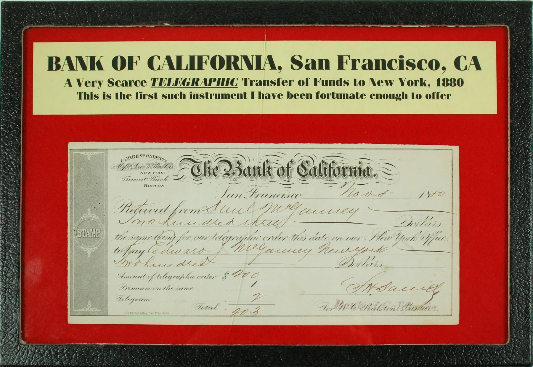 We have not seen one of these before! Transfer from Saul McGanney of $203.00 to Edward J McGanney of New York. Printed "W. C. Ralston, cashier" Stamped over with "Bank of California." Signed by SH David. Edward was a New York lawyer. Crack in glass. Excellent condition. Slight foxing on bottom right. (Potter Collection)
