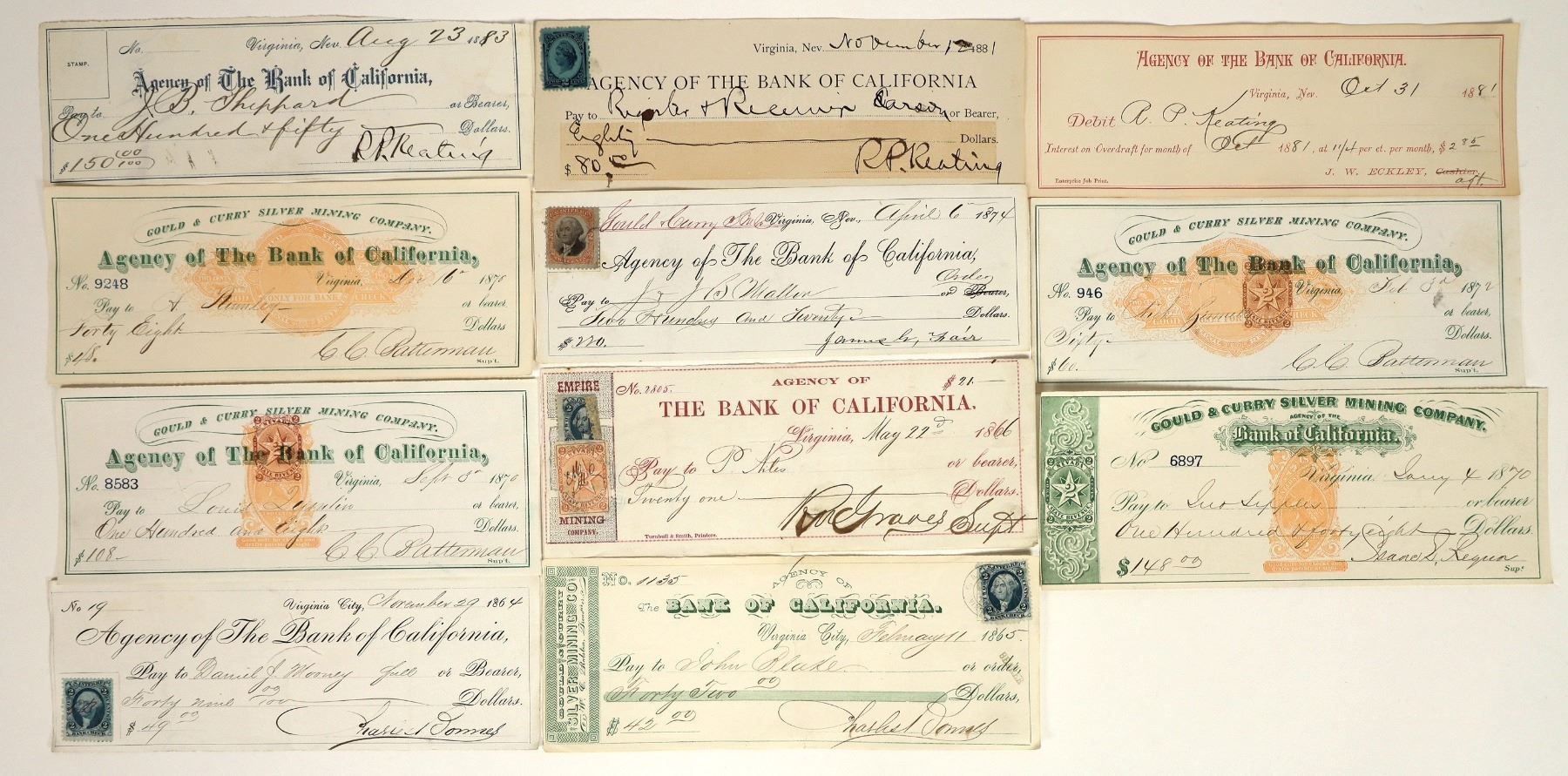 Lot of 11 different. This is a fantastic collection! The Bank of California Virginia City branch opened in September 1864 with William Sharon installed as cashier. Sharon, along with WC Ralston, would build the bank into a powerhouse firm that controlled most of the Comstock mining properties in the 1860s before being unseated by Mackay, Fair, Flood, & O'Brien. First is an extremely rare and early November 1864 check--just two months after opening! This is signed by Charles Bonner for the Gould & Curry. Other pieces include: Gould & Curry 1866 (signed by Bonner); 1866 Empire Mill & Mining Co. signed by Graves, NV adhesive stamp; 1870 signed by Requa, RN-B and green printed NV stamp; 1870 G&C with rare RN-B17b, signed by Batterman; 1870 with RN-C, signed by Batterman; 1872 G&C with rare RN-C21b, signed by Batterman; 1874 signed by Bonanza King James G. Fair; 1881 and 1883 signed by RP Keating (for Savage Mine); and 1881 debit slip.