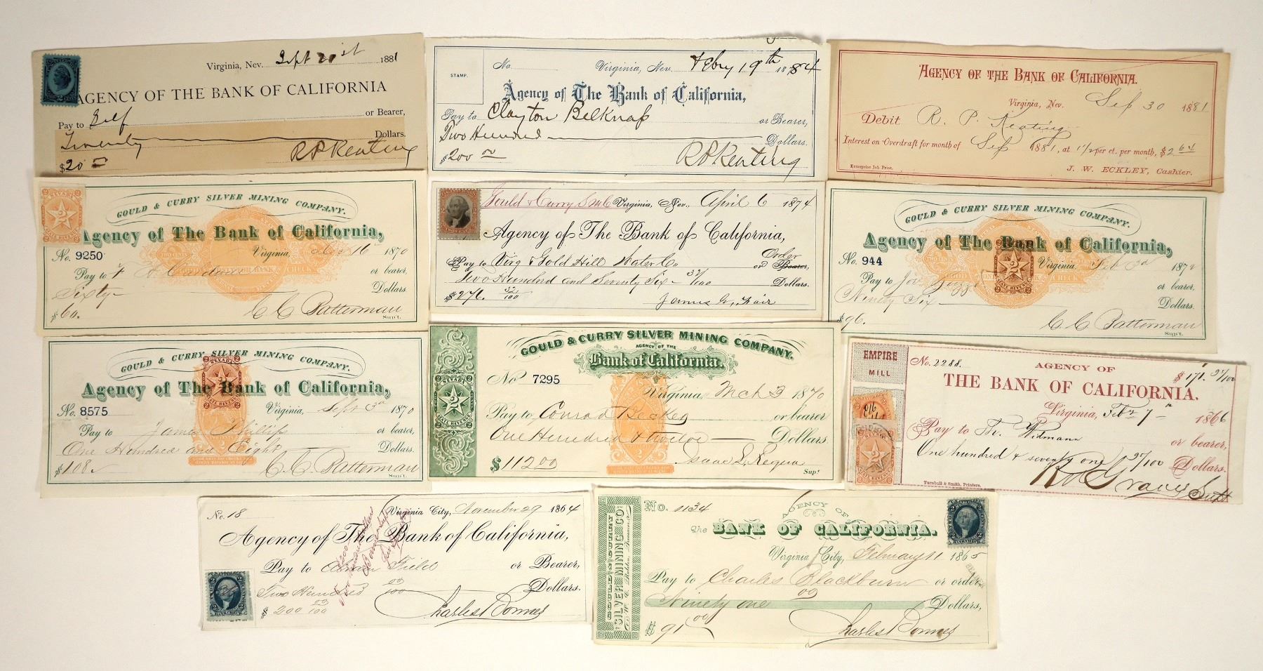Lot of 11 different. This is a fantastic collection! The Bank of California Virginia City branch opened in September 1864 with William Sharon installed as cashier. Sharon, along with WC Ralston, would build the bank into a powerhouse firm that controlled most of the Comstock mining properties in the 1860s before being unseated by Mackay, Fair, Flood, & O'Brien. First is an extremely rare and early November 1864 check--just two months after opening! This is signed by Charles Bonner for the Gould & Curry. Other pieces include: Gould & Curry 1865 (signed by Bonner); 1866 Empire Mill & Mining Co. signed by Graves, NV adhesive stamp; 1870 signed by Requa, RN-B and green printed NV stamp; 1870 G&C with rare RN-B17b, signed by Batterman; 1870 with RN-C and orange NV adhesive, signed by Batterman; 1872 G&C with rare RN-C21b, signed by Batterman; 1874 signed by Bonanza King James G. Fair; 1881 and 1884 signed by RP Keating (for Savage Mine); and 1881 debit slip.