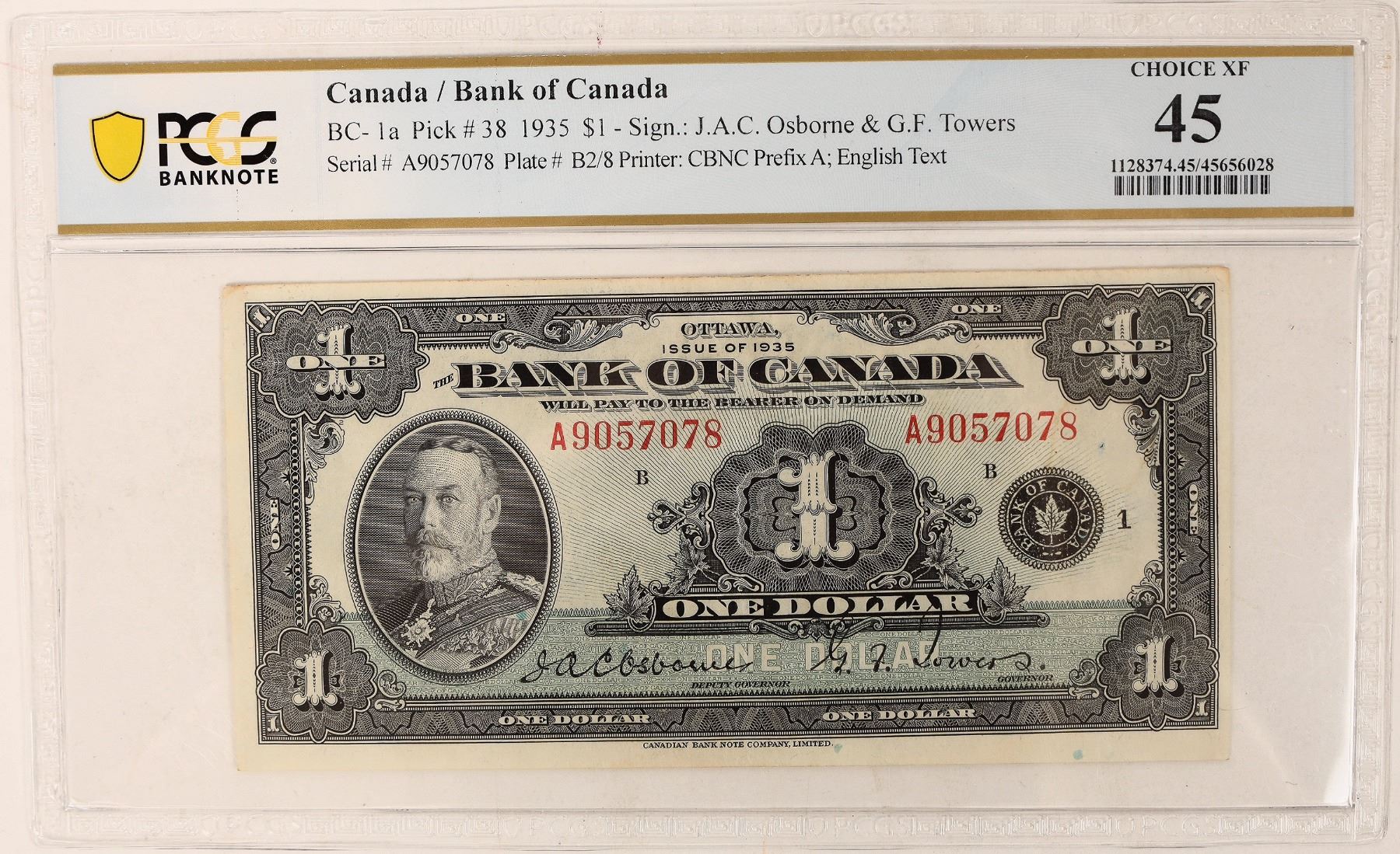 PCGS banknote certified Choice Extra Fine 45. BC - 1a Pick #38. Signed J. A. C. Osborne & G. F. Towers. Serial number A9057078. Printed by Canadian Bank Note Company. The first banknotes issued by the Bank of Canada. Features a portrait of King George V who reigned from 1910 to 1936.