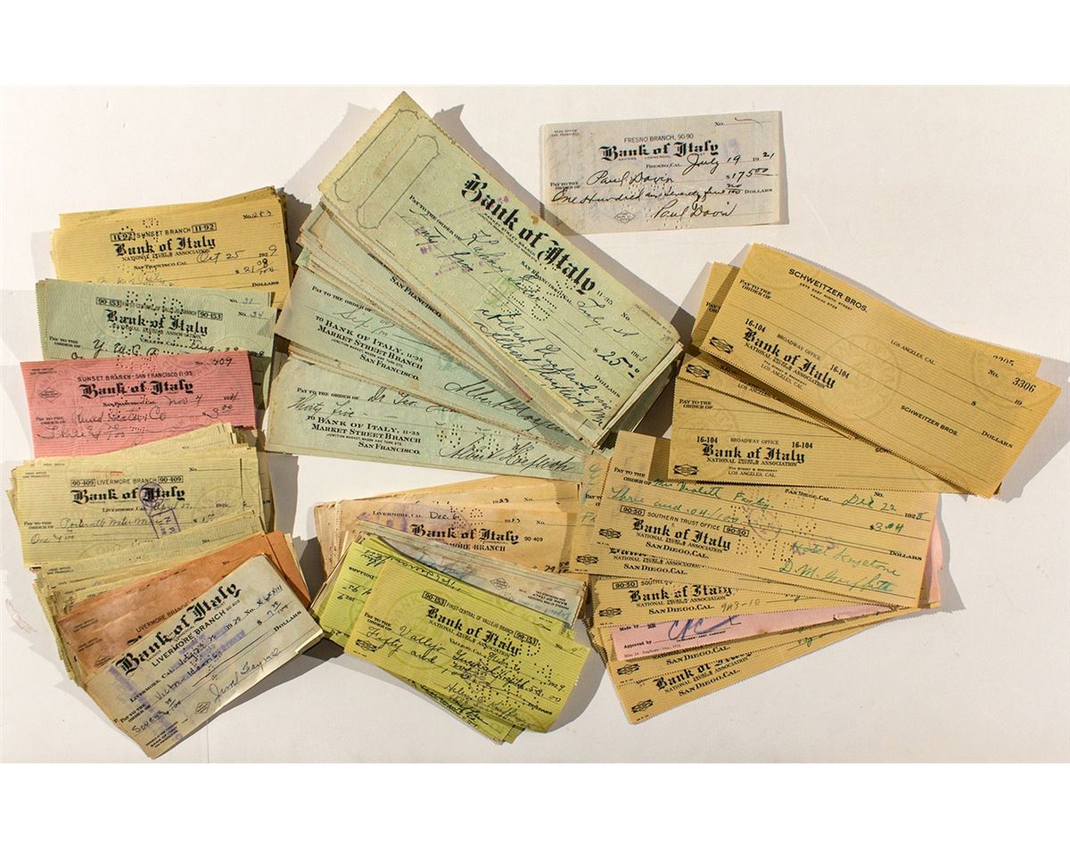 Huge lot of 350 checks, most from the 1920s. Checks from branches in Los Angeles, San Diego, Fresno, San Francisco, Livermore, and Vallejo. Some have water damage. The Bank of Italy was formed in 1904 by Amadeo Giannini in San Francisco. It became Bank of America. (Prag Collection)